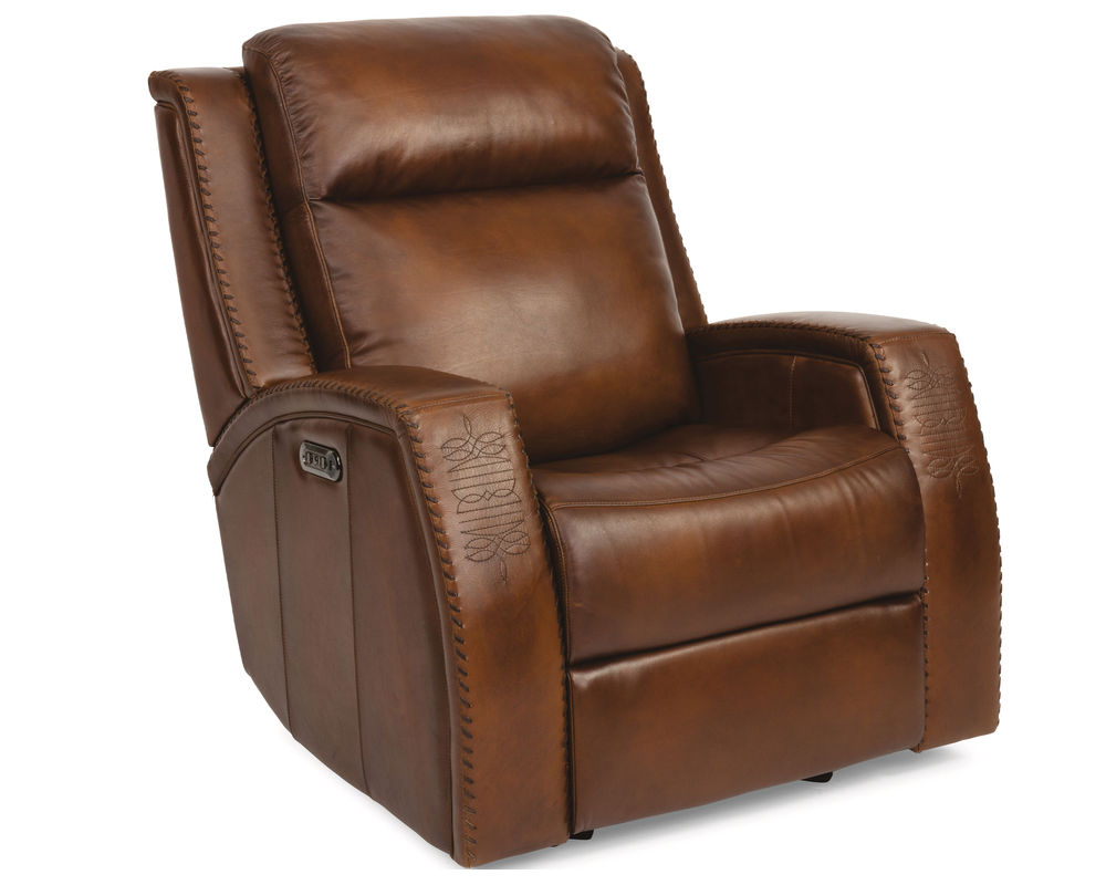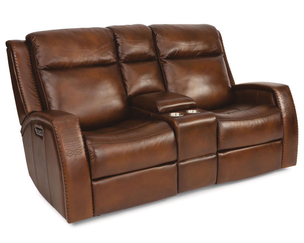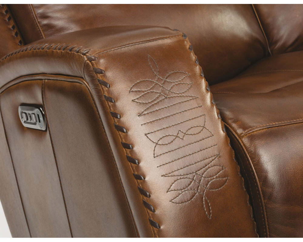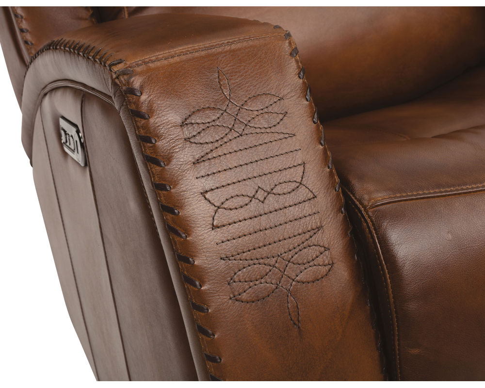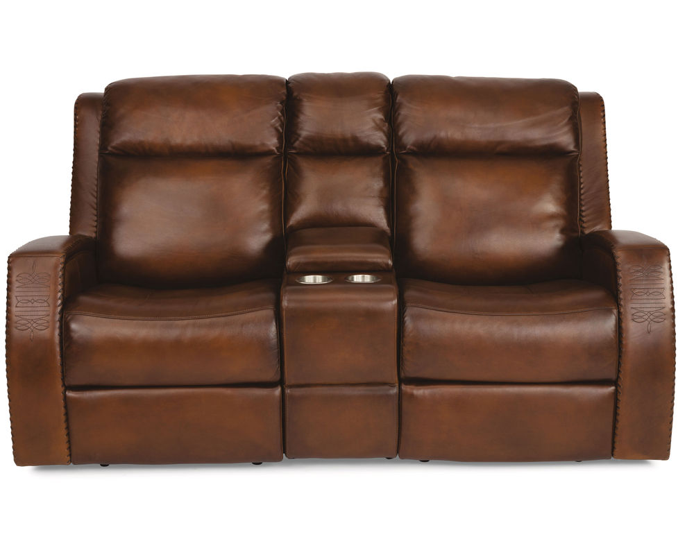 Add a little Western flair to your home with the Mustang Power Reclining Loveseat with Console and Power Headrests. Intricately stitched patterns on the arms, reminiscent of cowboy boots, and seams stitched in a contrasting color give this loveseat a unique look. A convenient storage console gives you a place to keep drinks, snacks and remotes nearby. Ergonomic design features include plush, divided back cushions, contoured bucket seats and fully padded footrests-all upholstered in a premium quality full-grain leather offering a natural look with a luxurious feel. Both sitters can independently adjust the headrests and recline with power controls in both arms, dialing in the perfect level of comfort. Our patented DualFlex Spring System™ ensures quality that will last, along with an ideal mix of firmness and support as you sit.