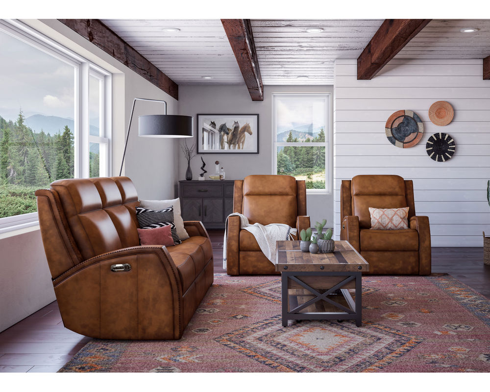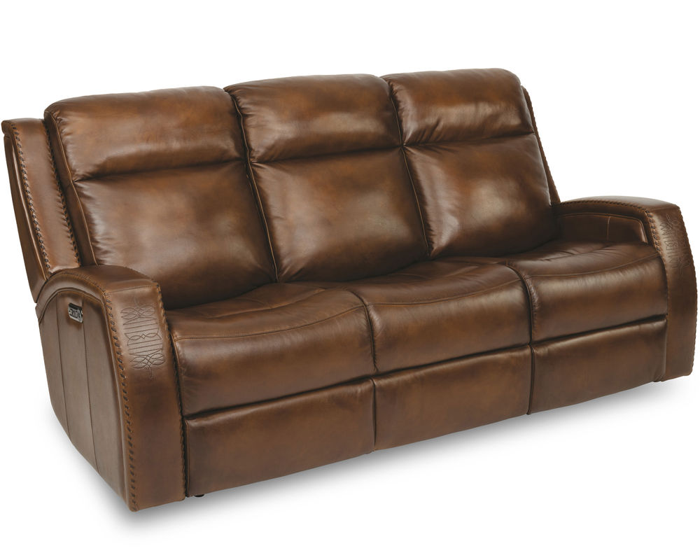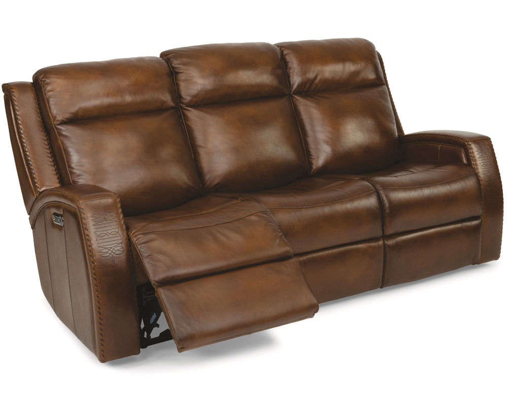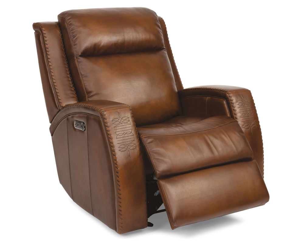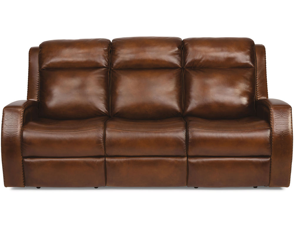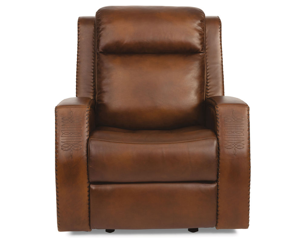 Add a little Western flair to your home with the Mustang Power Reclining Loveseat with Console and Power Headrests. Intricately stitched patterns on the arms, reminiscent of cowboy boots, and seams stitched in a contrasting color give this loveseat a unique look. A convenient storage console gives you a place to keep drinks, snacks and remotes nearby. Ergonomic design features include plush, divided back cushions, contoured bucket seats and fully padded footrests-all upholstered in a premium quality full-grain leather offering a natural look with a luxurious feel. Both sitters can independently adjust the headrests and recline with power controls in both arms, dialing in the perfect level of comfort. Our patented DualFlex Spring System™ ensures quality that will last, along with an ideal mix of firmness and support as you sit.