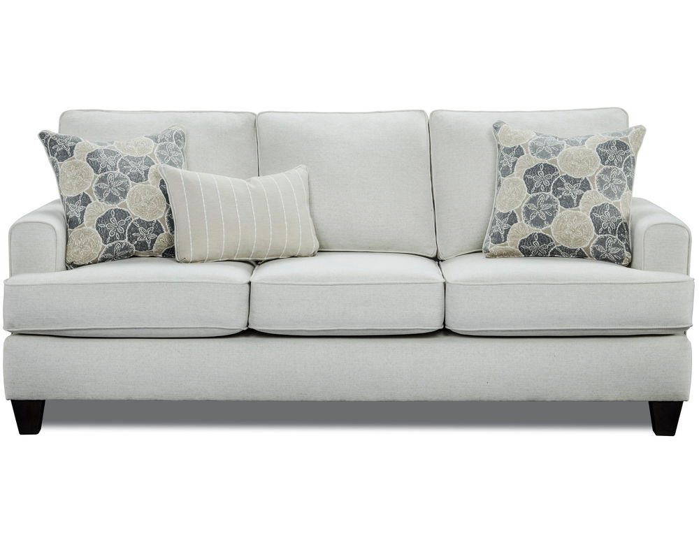 Introducing the Max Pearl Queen Sleep Sofa, a stunning and versatile piece of furniture for your living room. This transitional sleeper sofa is perfect for smaller spaces, providing style and functionality. The couch is adorned with contrasting pillows and an accent kidney pillow, adding a touch of elegance to your home décor.