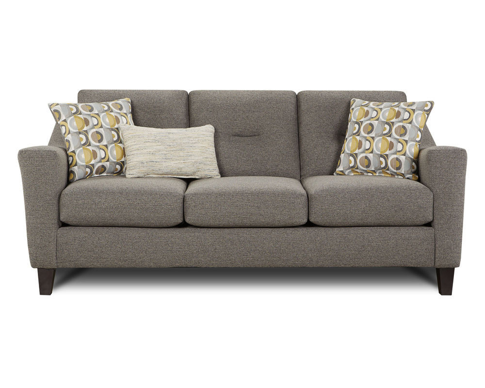 Introducing the Dillist Mica 86" Sofa, a unique blend of mid-century modern style and ultimate comfort. This sofa stands out with its distinctive sloped track arm design and elegant tapered wood legs in a coffee finish. The sleek tufting on the inside back pillows adds a touch of sophistication to its overall look, making it a stunning piece of furniture.