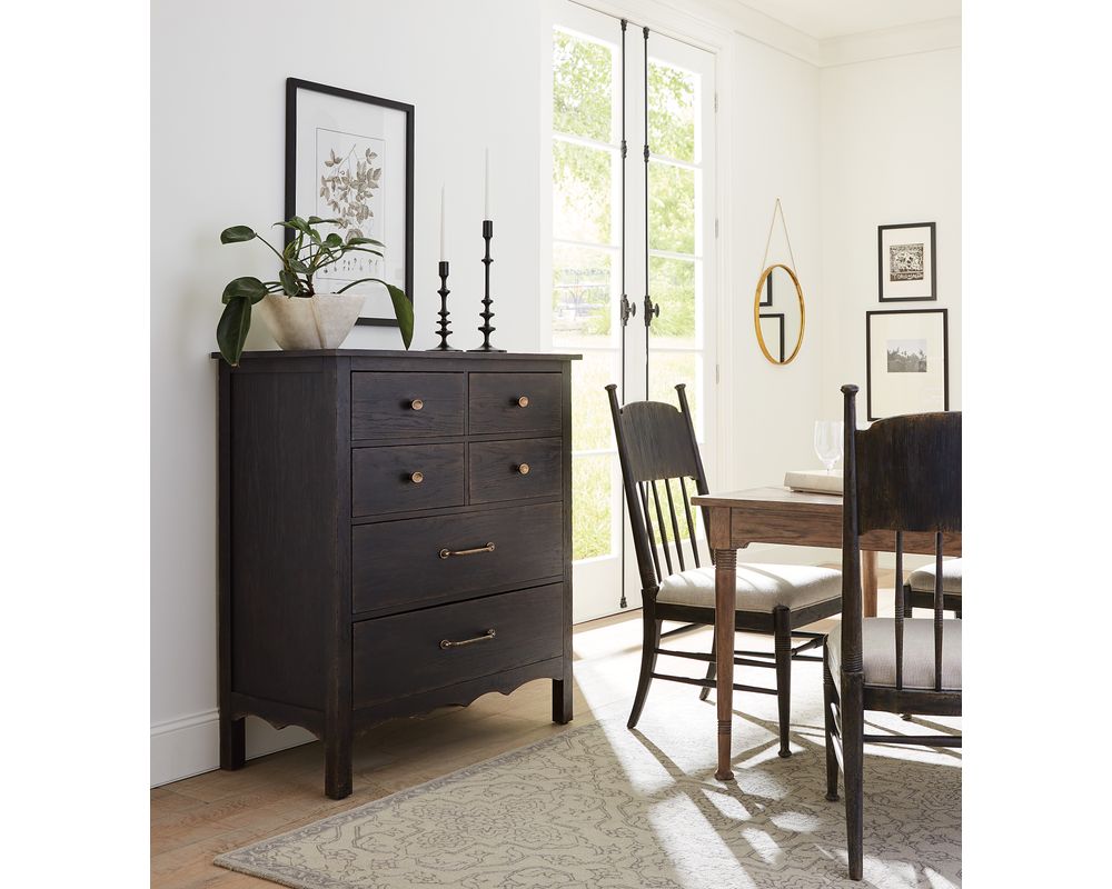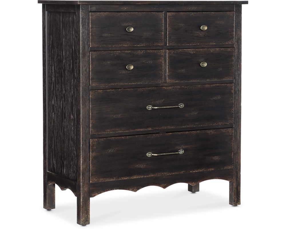 From Sofas and Sectionals.com: Introducing the Americana Six Drawer Chest, a beautiful addition to any bedroom. This chest features six spacious self-closing drawers, providing ample storage space for all your belongings. The top drawers have removable black felt liners, perfect for organizing and protecting delicate items. The bottom drawer is cedar lined, offering a natural way to keep your clothing fresh and free from pests.