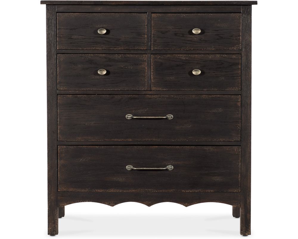 The drawer interiors are finished in a beautiful Honey color, adding a touch of elegance to the overall design. The chest also features a scalloped shaped base, adding a subtle touch of sophistication to the piece. Additionally, the metal alloy knob pulls in an antique bronze finish, adding a vintage charm to the chest.