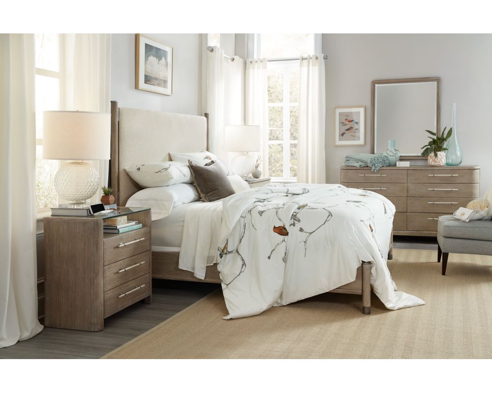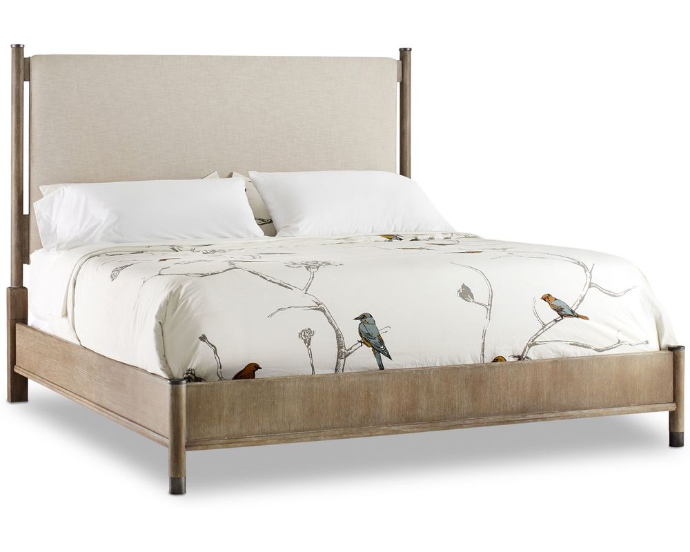 Chic and modern, the Affinity King Upholstered Bed contrasts a headboard upholstered in Kurtz Linen with the sides and footboard in a greige sand-blasted finish on tactile quartered oak veneers. The fabric is a polyester-linen blend, and the 6050-90967-GRY Headboard can be used alone. Soft, rounded forms combine with sand-blasted greige and antique white finishes to create an inviting transitional boutique collection in Affinity. The main finish for the 20-piece collection of bedroom, dining room, occasional, accents and home entertainment is a wire-brushed greige (gray/beige) on quartered white oak. Pewter and antique white hardware and soft linen fabrics add intrigue.