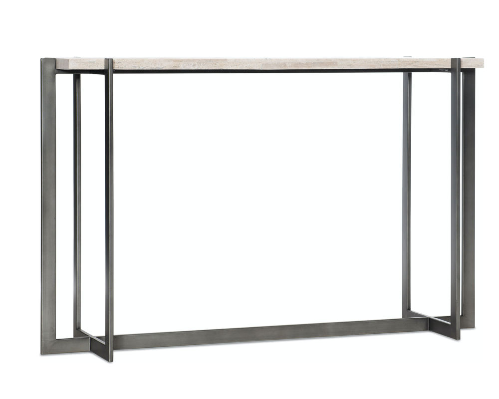 With a streamlined shape and interlocking base, the Commerce & Market Console Table is a modern silhouette with a White Travertine Stone top and base made of Carbon Steel in a dark gray finish.