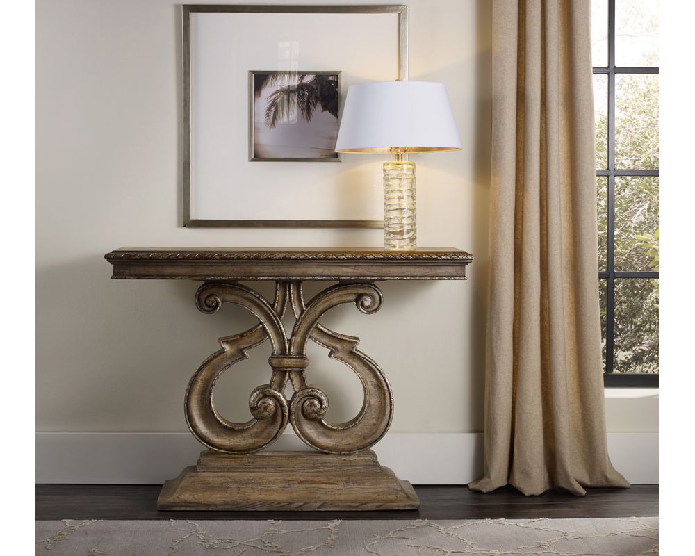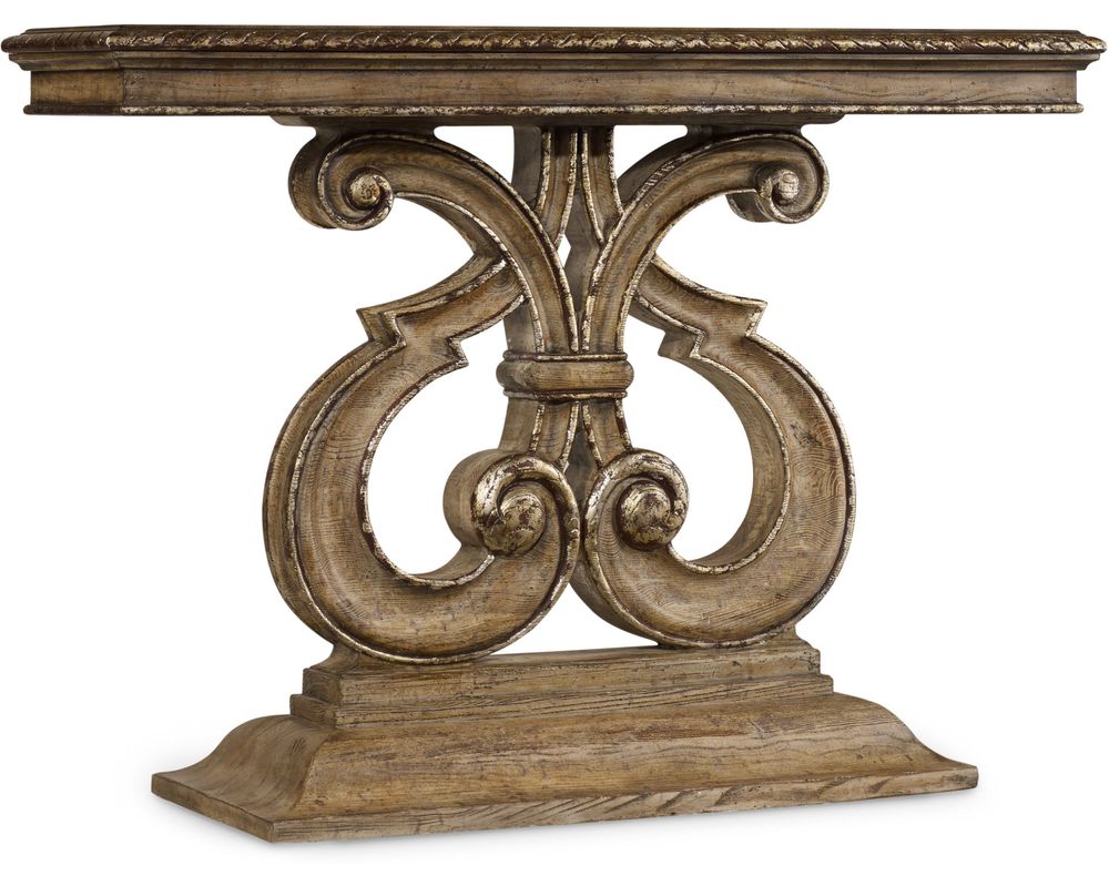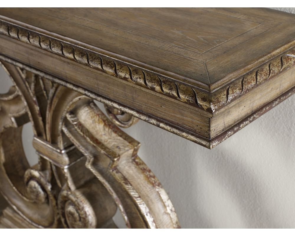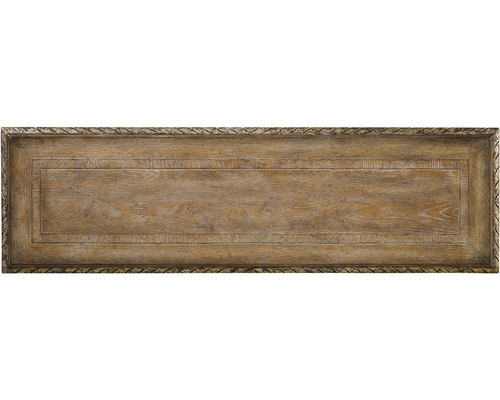 This console table's finish is Solana, and it features a soft, casual wire-brushed finish. The natural wood look is a light caramel latte with a subtle white lacey hangup and a gray undertone accented by gold highlights. The distressing includes chopping and wormholes, giving the table a charming, rustic feel.
