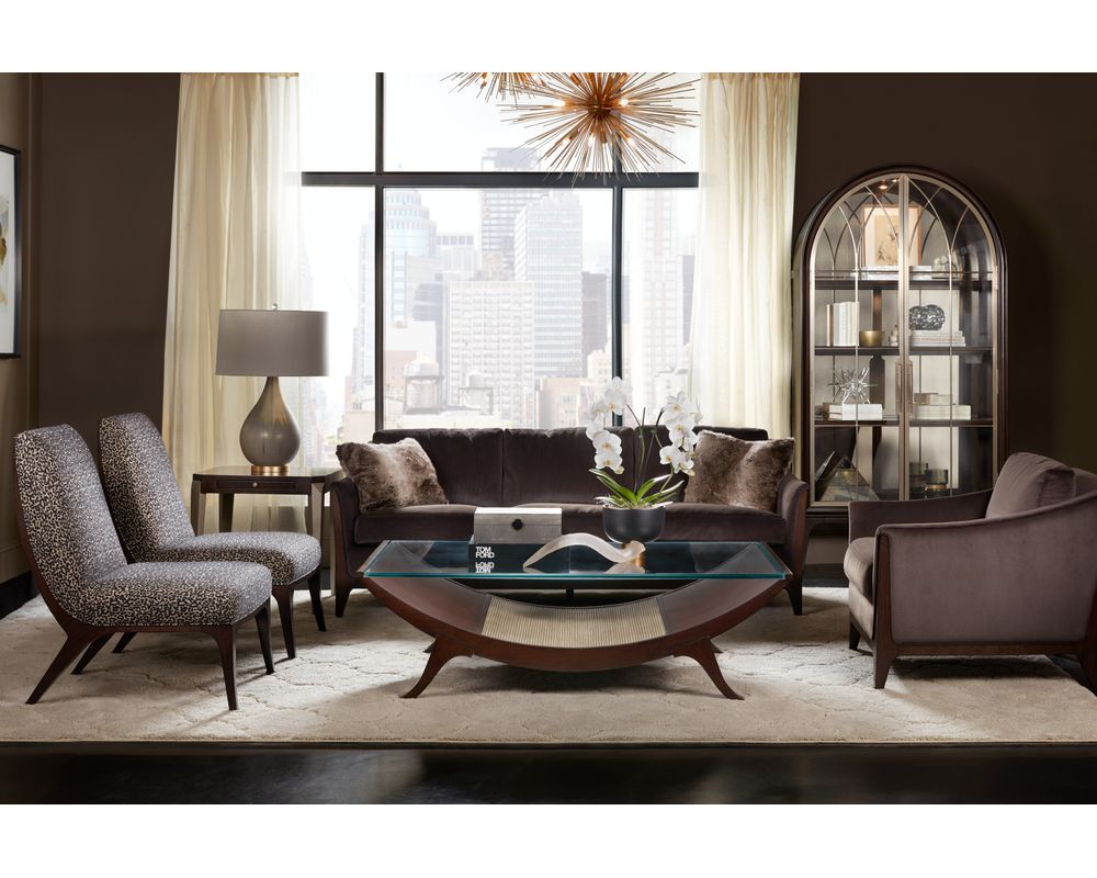 Hooker Furniture's Bella Donna collection is characterized by its elegant forms, rich with shape and movement. Channeling Sophia Loren's timeless sophistication and style as its muse, Bella Donna appeals to the classic consumer but with a little "edge" to their design style. Caviar, the primary finish for Bella Donna, has a deep translucent tone on rich cathedral cherry veneers. Akoya, representing the purest white pearls in the world, is a perfect accent finish, adding sophistication and a bit of glam. Unique design details include reeding on selected pieces that create a "curtain effect," reverse breakfront serpentine silhouettes, glass tops, and exposed metal legs. Adding the finishing touch, this home collection features custom-designed hardware in a champagne finish, including traditional and modern forms.