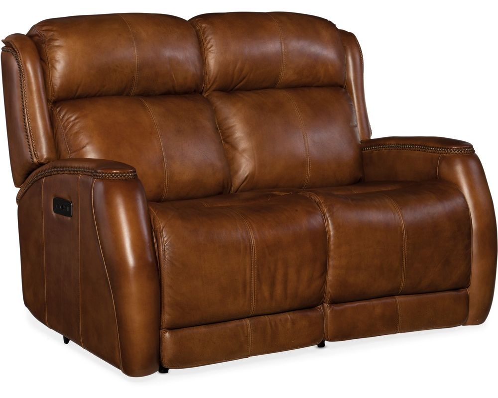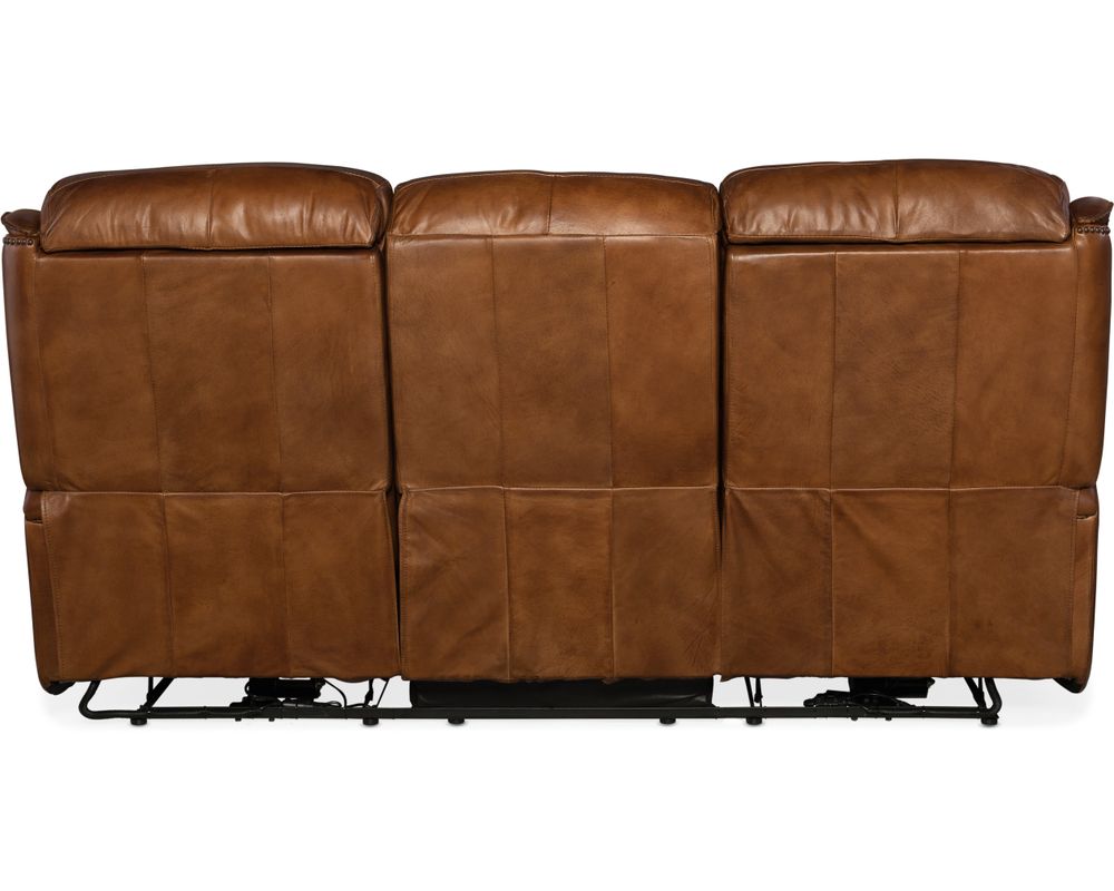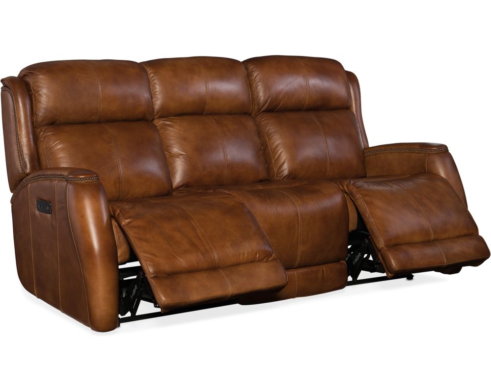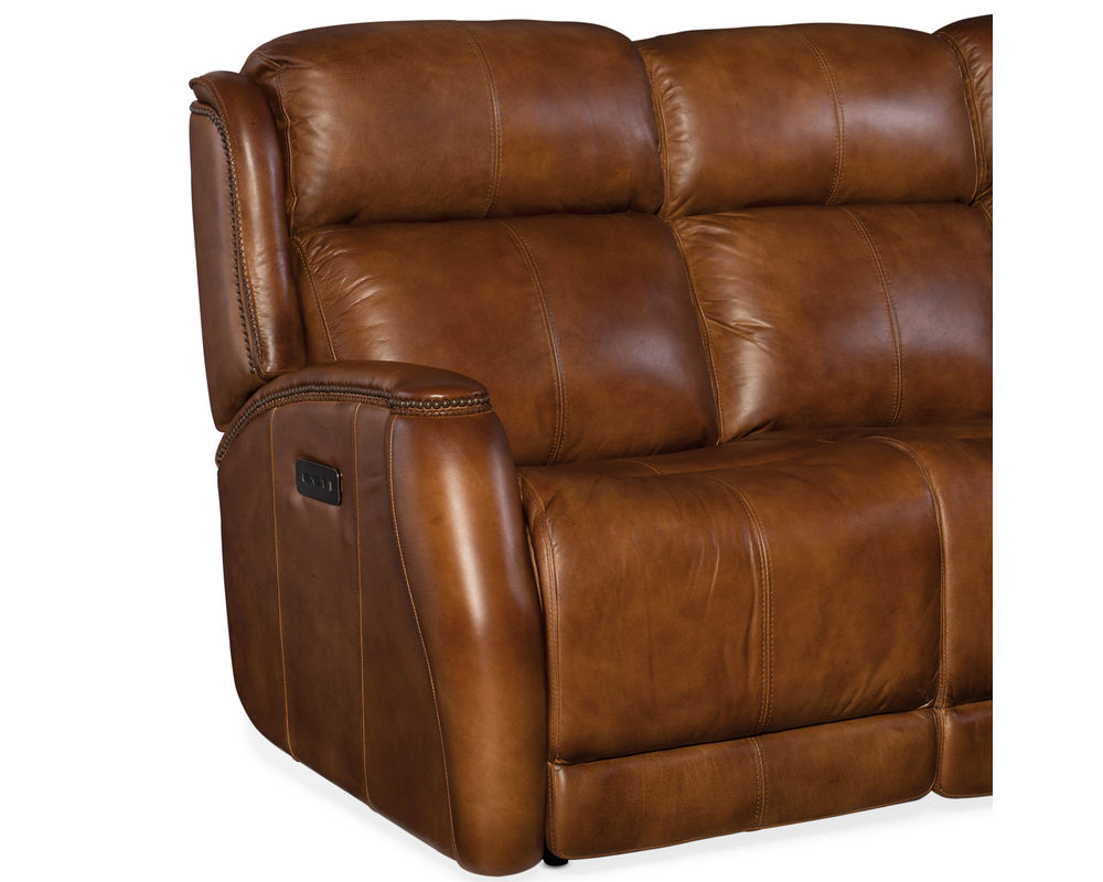Warm up your home and reward yourself at the end of the day with the Emerson Power Recliner Sofa. While you're recharging with head-to-toe support from the power-activated waterfall chaise-pad ottoman, you can charge your phone in the USB port located in the power button. The aniline top-grain earthy brown leather is hand-wiped for a natural look, and the soft rounded arms are capped with a leather pad and trimmed with decorative welting and antique brass nails. Your neck and shoulders will appreciate the neck-roll back and power headrest. Developed by one of America's most famous and respected furniture manufacturers, Hooker Furniture Upholstery offers high quality leather at affordable prices.