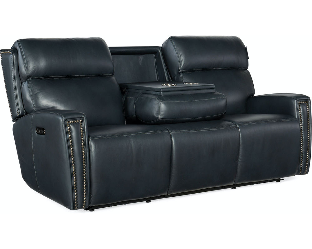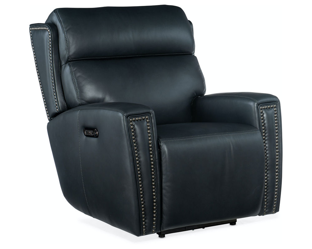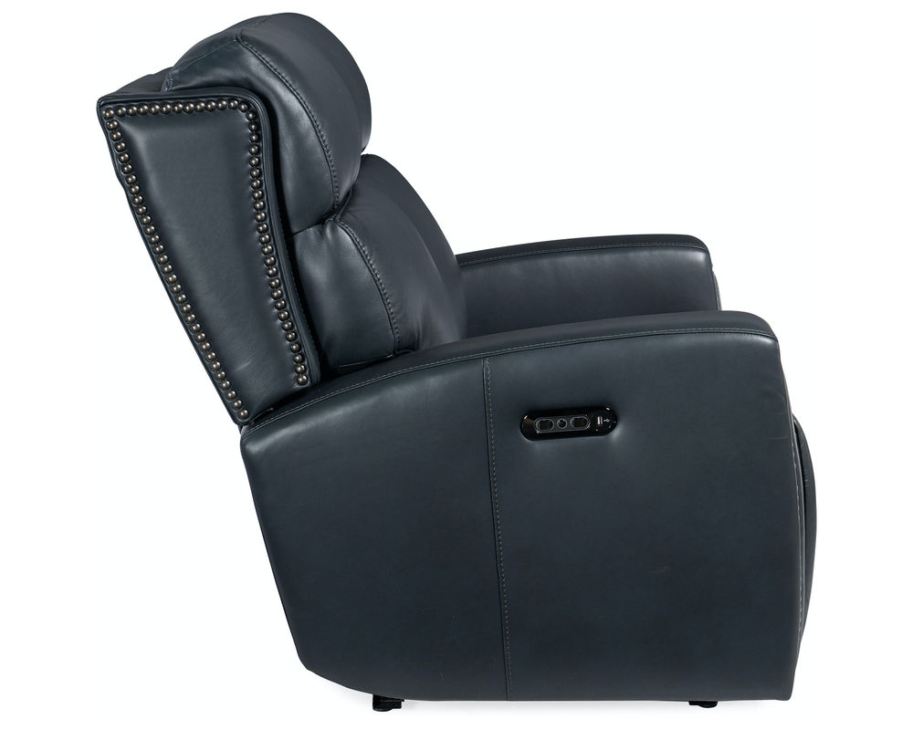 The modern silhouette of the Ruthe Zero Gravity Power Recliner has vintage inspiration, including the fresh twist on a wing chair profile and traditional brass nailhead trim. Featuring a casual bustle-style back, power headrest and a USB port, the Ruthe is covered in the warm Derrick Denim semi-aniline top-grain leather.