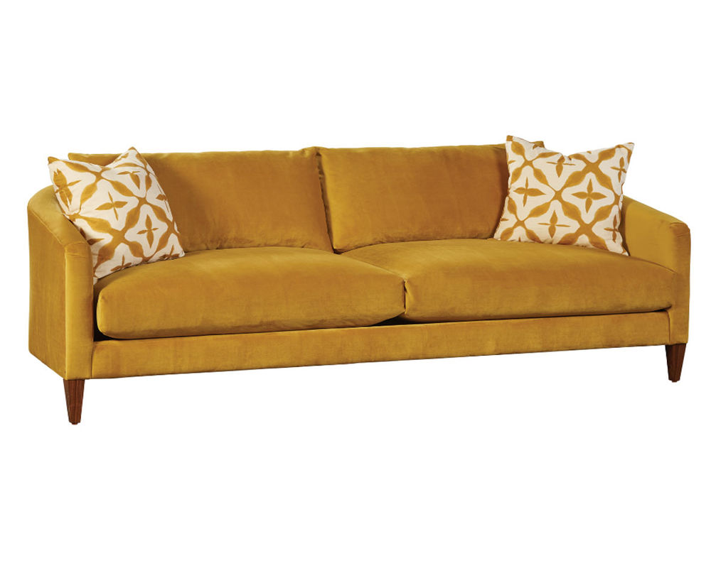 The Darcy S0220 Sofa is a sophisticated and modern addition to any home. This stylish sofa has a rounded back that seamlessly transitions to sleek track arms. Two seating cushions provide ample comfort for relaxing. The deep walnut finish on the conical legs adds a touch of elegance to this timeless piece. To complete the look, two 21-inch toss pillows are included. Enjoy a modern style with the Darcy Sofa.