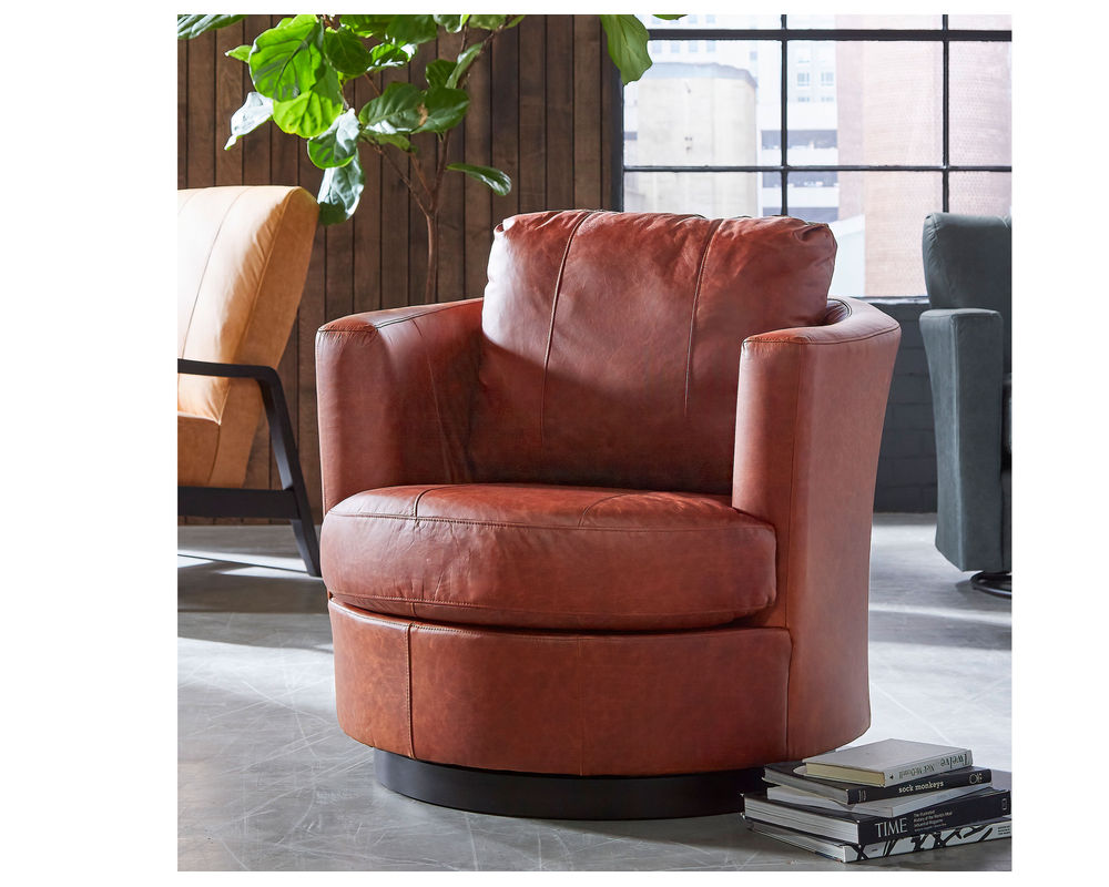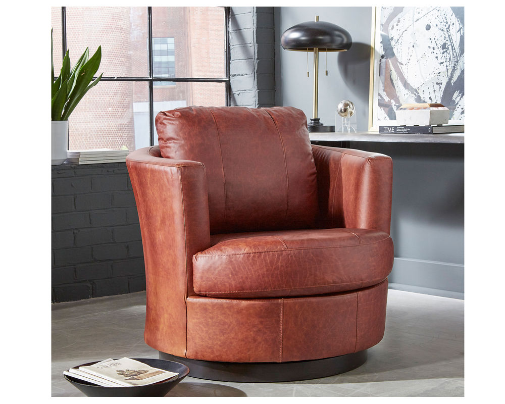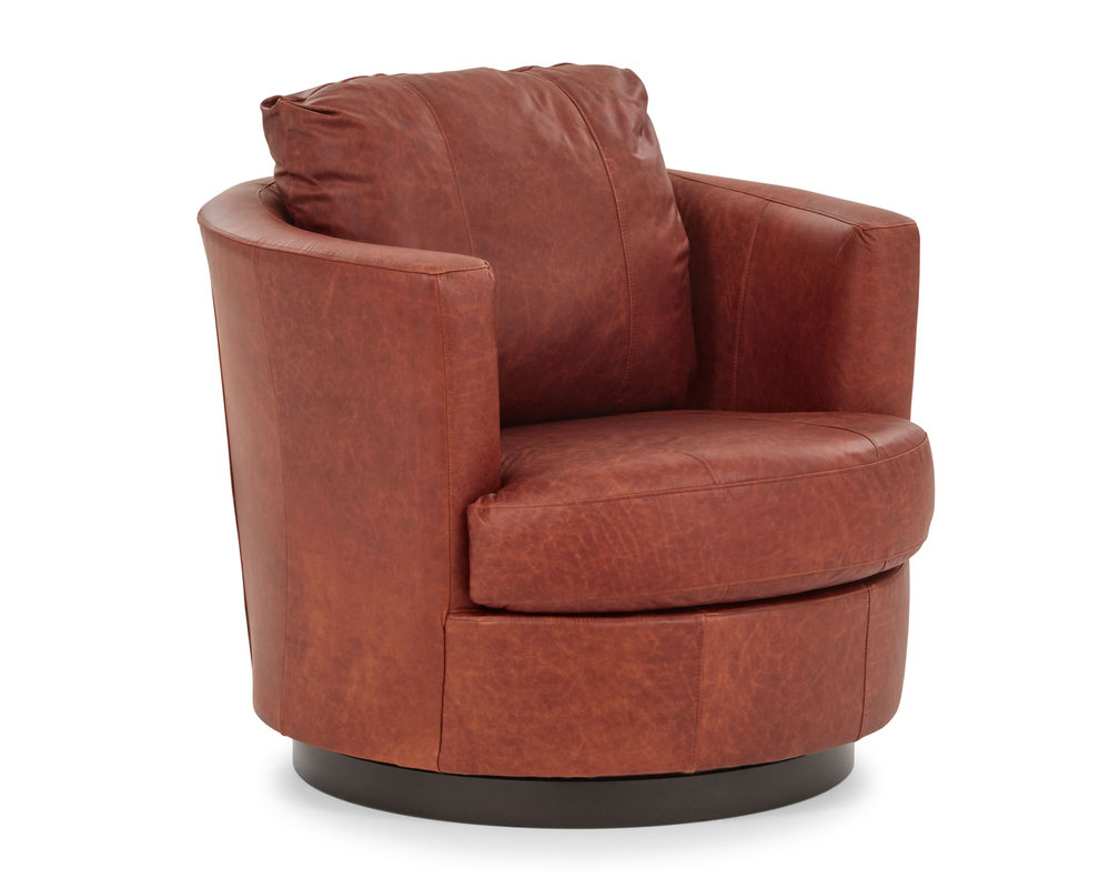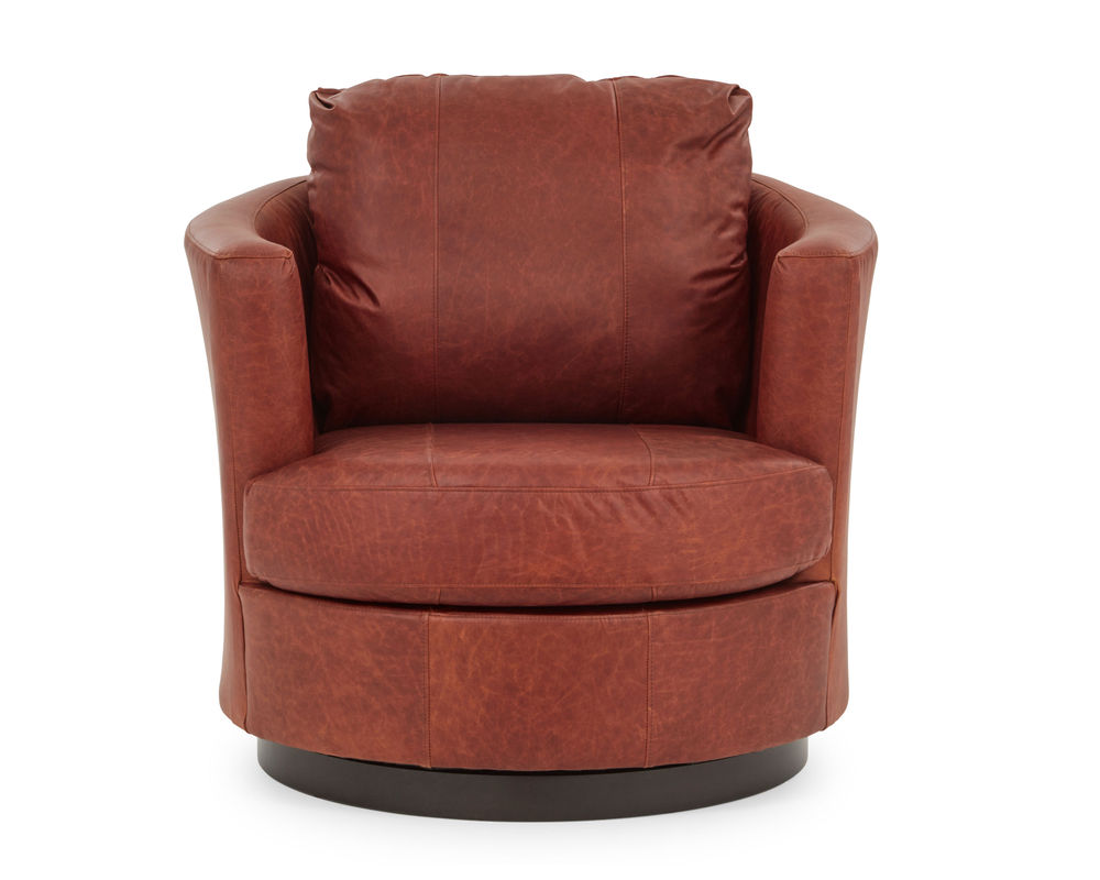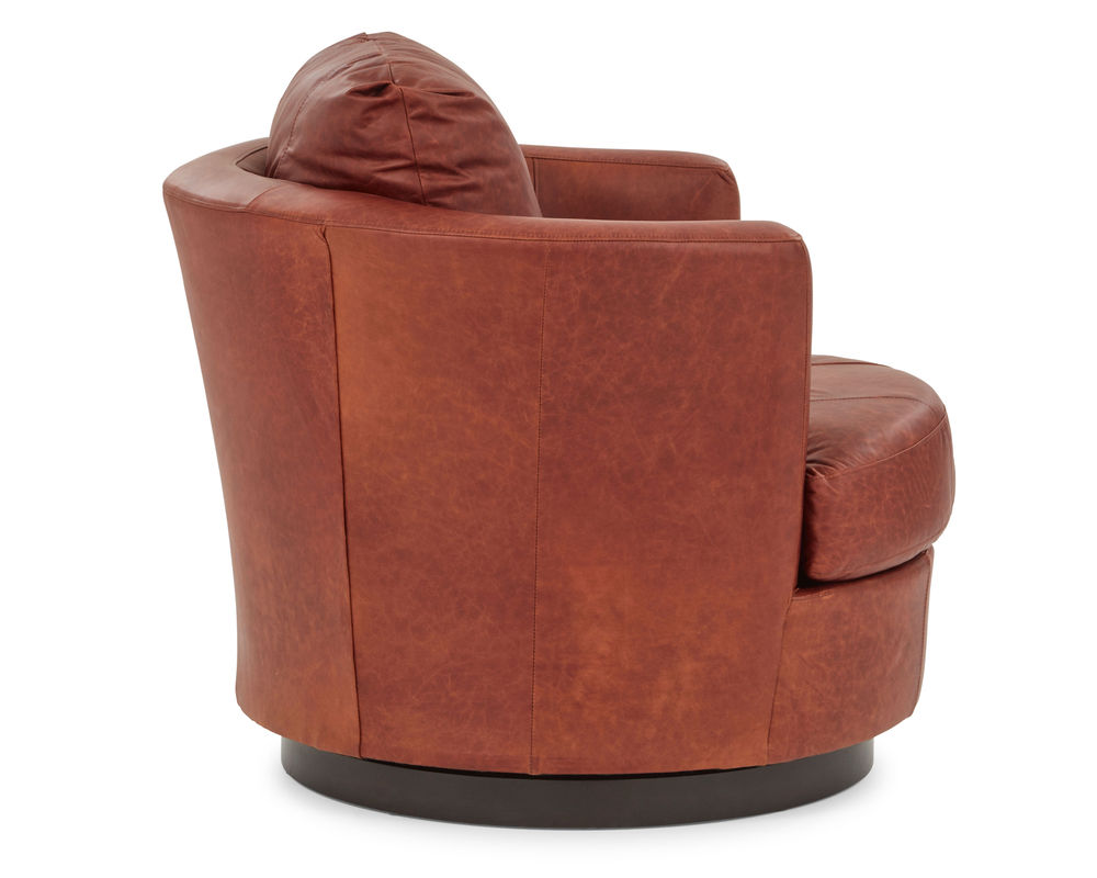 Bring timeless style and comfort into your home with the Tina 2998 Leather Swivel Chair. Featuring a fully curved back and barrel silhouette, this chair offers a pop of retro-mod charm that looks great in any space. The low-profile base discreetly hides the graceful swivel action. It's designed with a reversible, solid foam T-seat for long-lasting comfort and support, and you can adjust the amount of pillow fibers in the back with zipper access in the lower back. Plus, you can choose the perfect look for your space with the swivel base coming upholstered or with a wooden base in three finish choices: Dark Walnut, Espresso, and Riverloom. With more than 100 fabric options or hand-selected top-grain leathers to choose from, you can make the Tina 2998 Leather Swivel Chair your own.