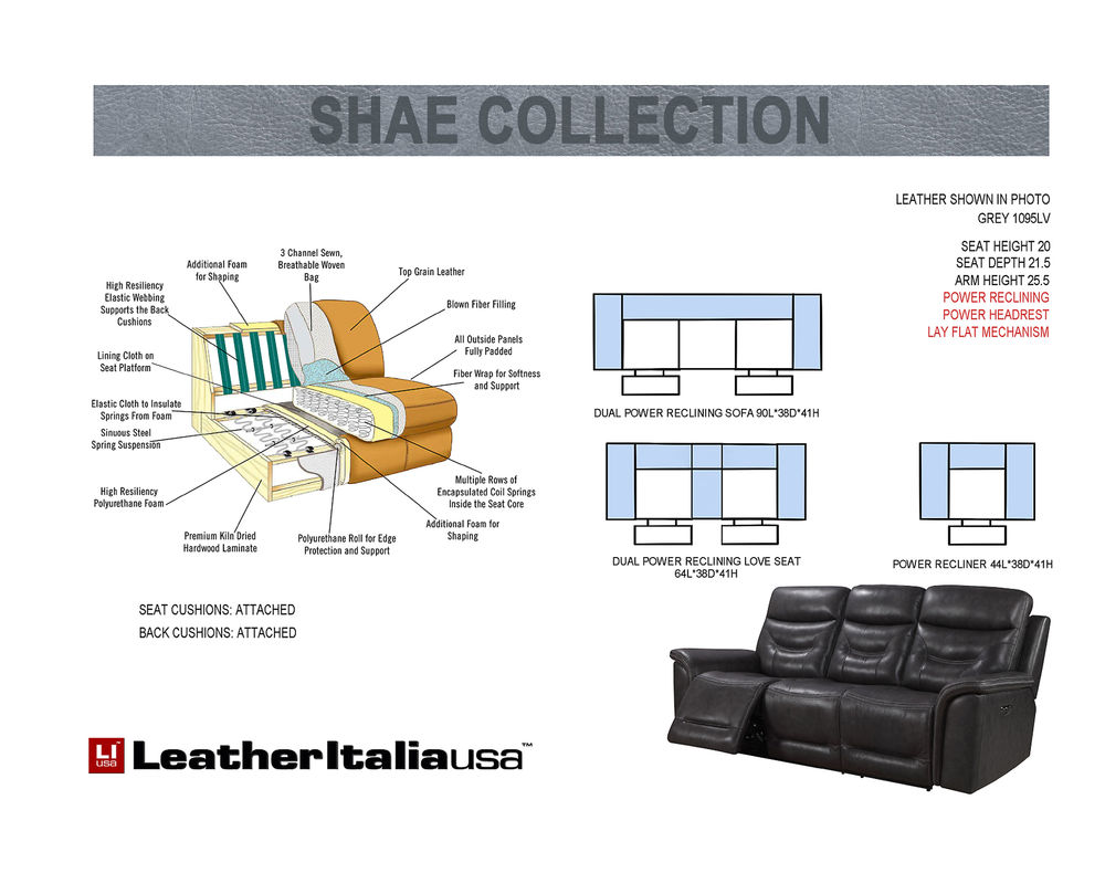 •. Pocket Seating Coils – Luxury Like a Pillow Top Mattress •. Leather Italia USA – Handcrafted Leather Furniture • Quality Built from the Inside Out •Structurally very strong frame using primarily hardwood and laminate •Corner blocked in all load bearing areas •The frames are padded so no wood ever touches the leather covering • Power Recline and Power Headrest Included •. Leather Everywhere Your Body Touches
