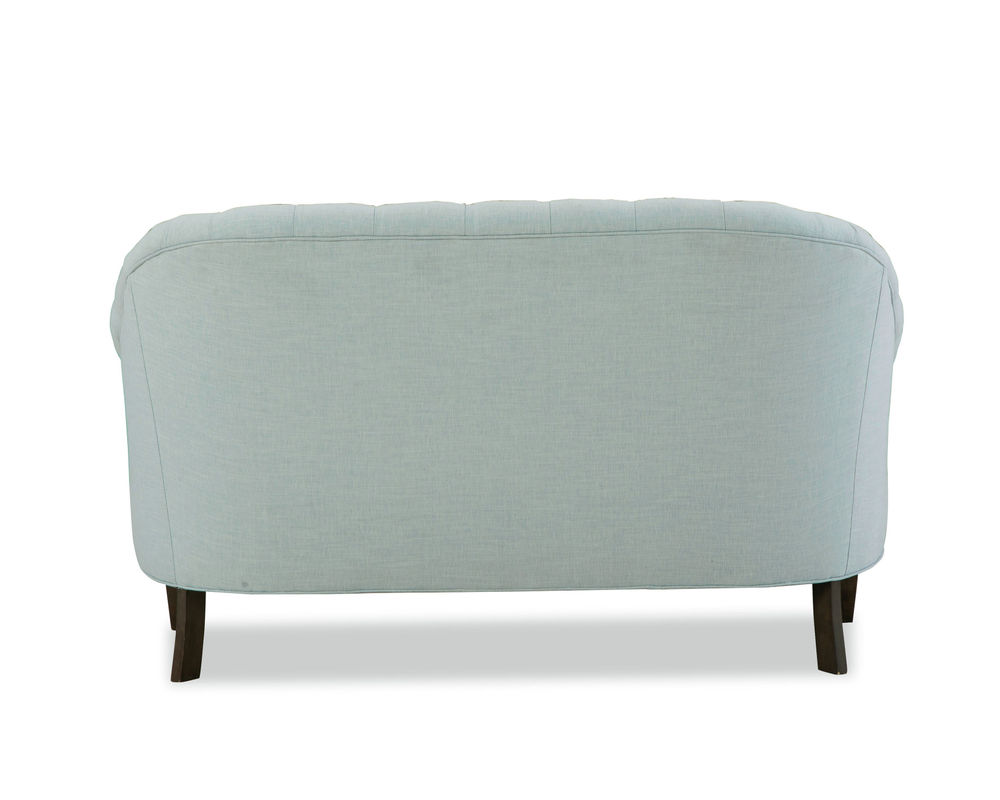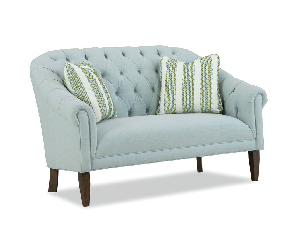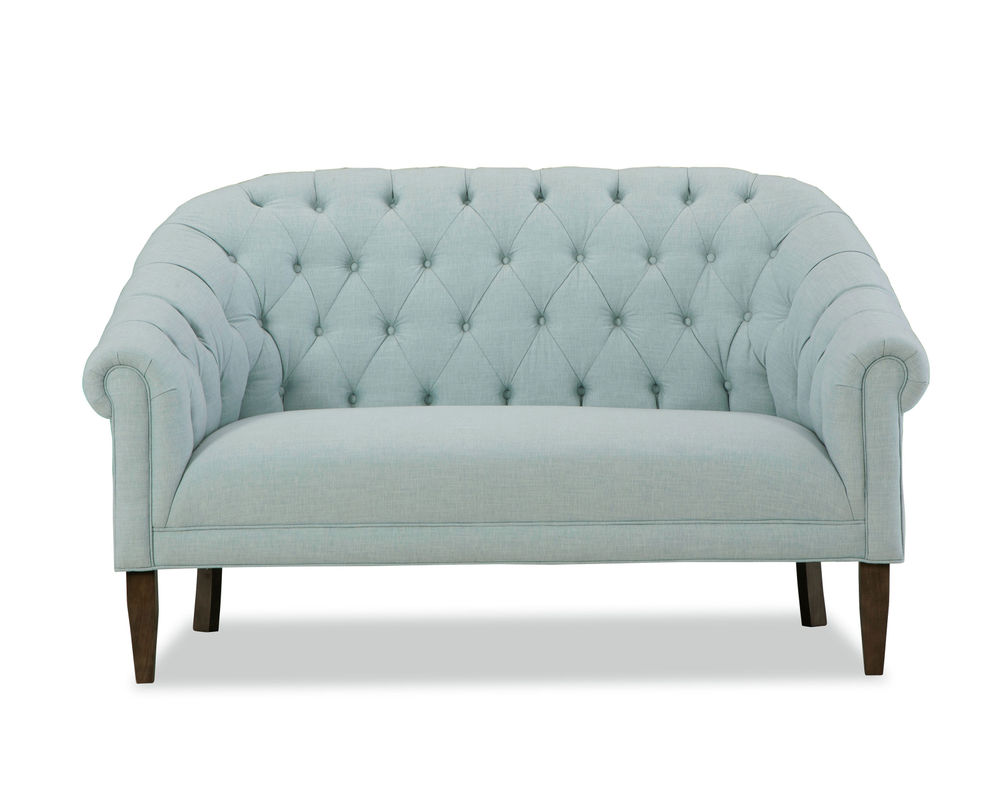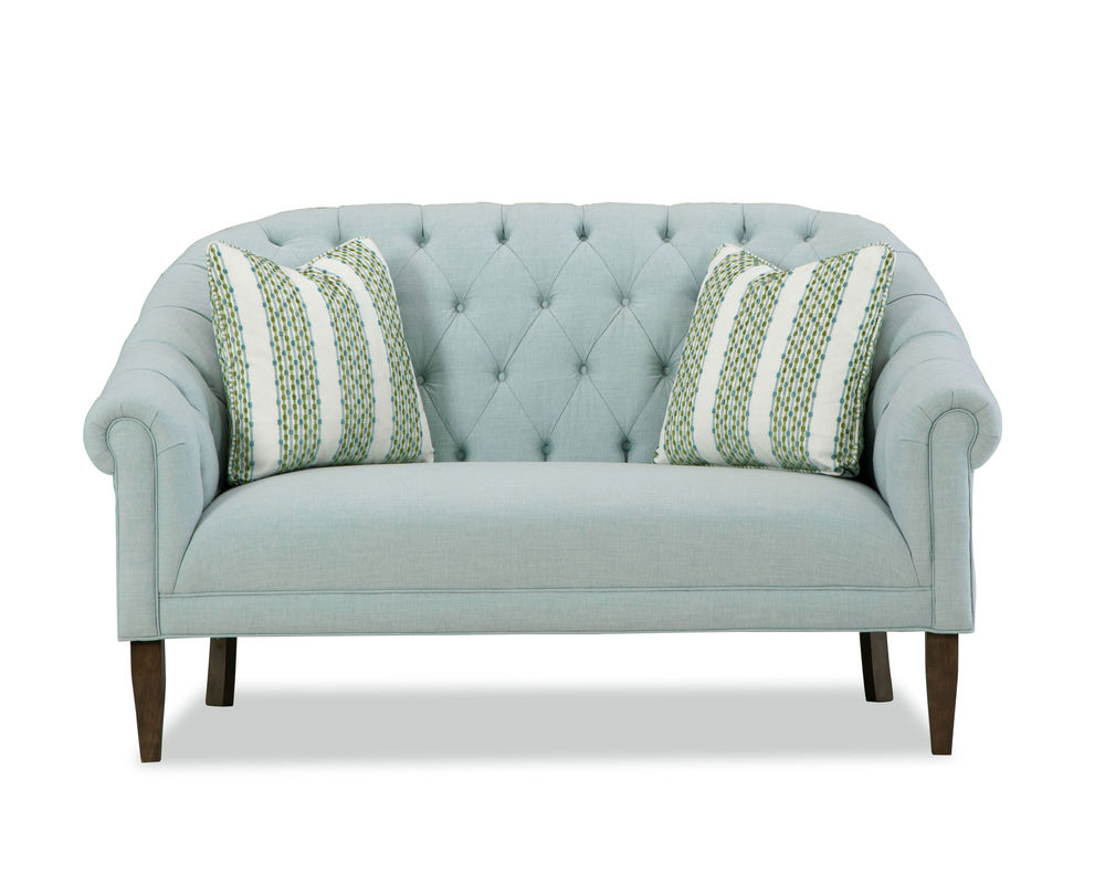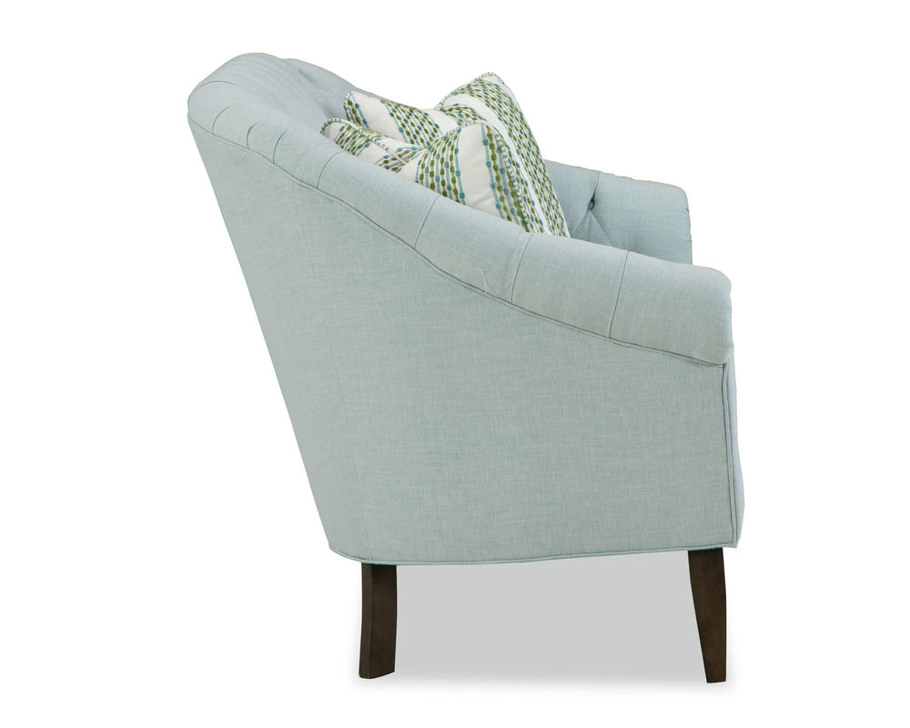 An elegant standout, this lovely piece from the Paula Deen Home collection features classic details such as a button tufted back, panel arms, tall tapered legs, and a barrel shape to wrap you in comfort. It's at home in living spaces, bedrooms, hallways or even at dining tables. Accented with Blend Down toss pillows. Over 100 performance fabrics.