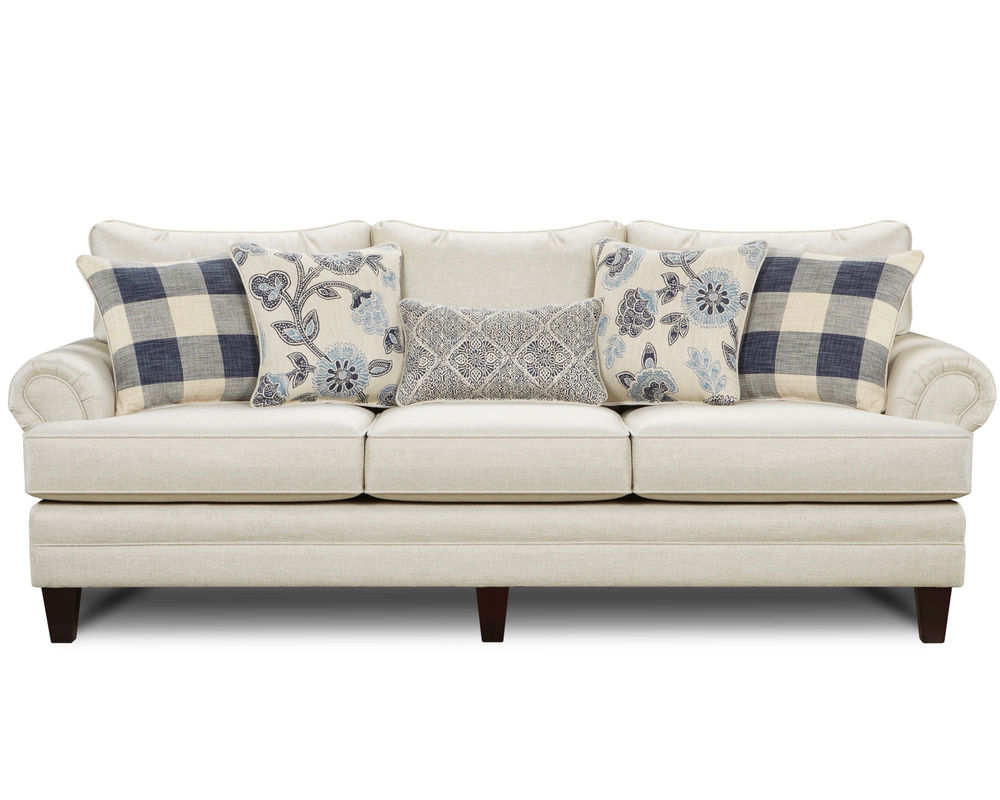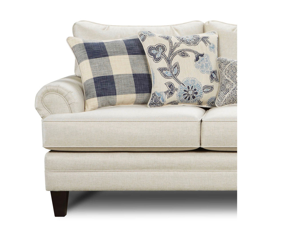Catalina Linen is a big, beautiful frame and has hints of traditional, but leans transitional with its tapered coffee legs and mixture of pillow combinations. It also features loose reversalble inside back cushions and loose reversable box border t-cushions which allow you to rotate them to prolong the life of the material and of the seat and back cores. With a bold plaid pair of pillows the beautiful floral accent pillows to its Moroccan kidney pillow, this sofa has extreme flexibility to fit into any room or home. It's today's casual traditional look that is sweeping the nation.