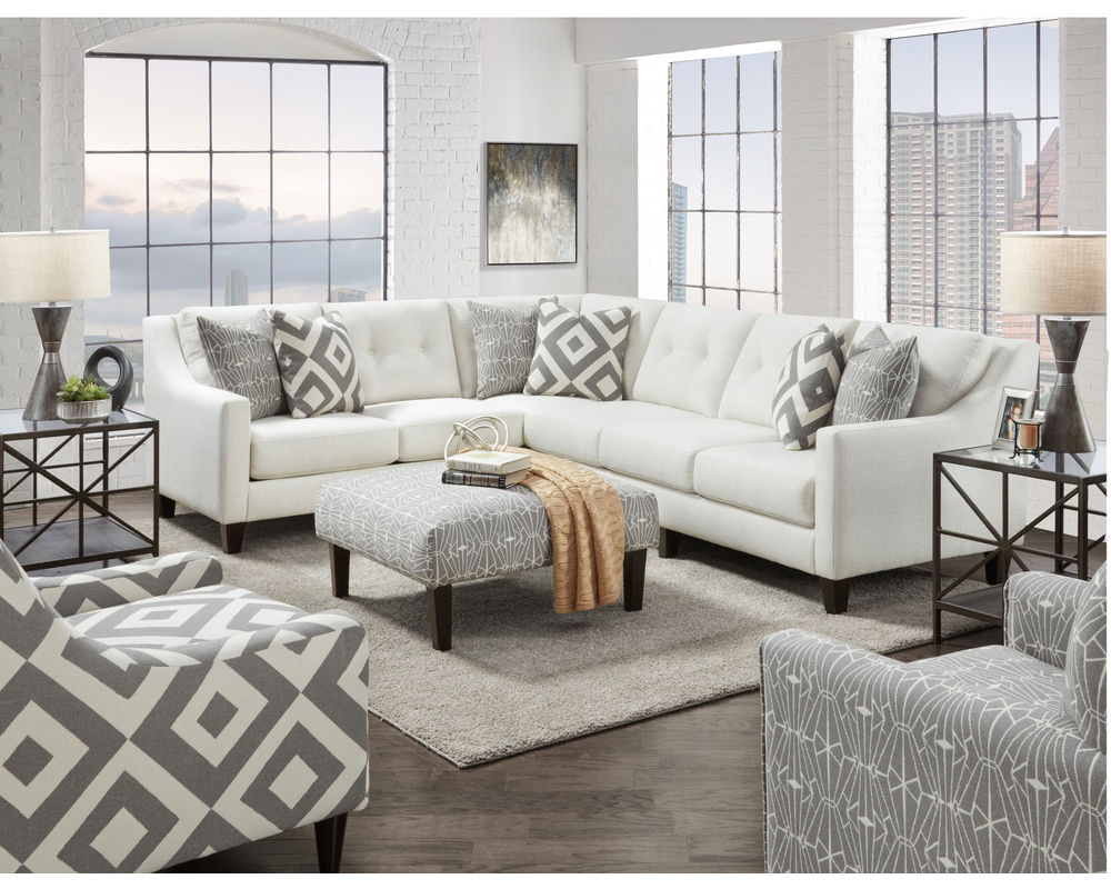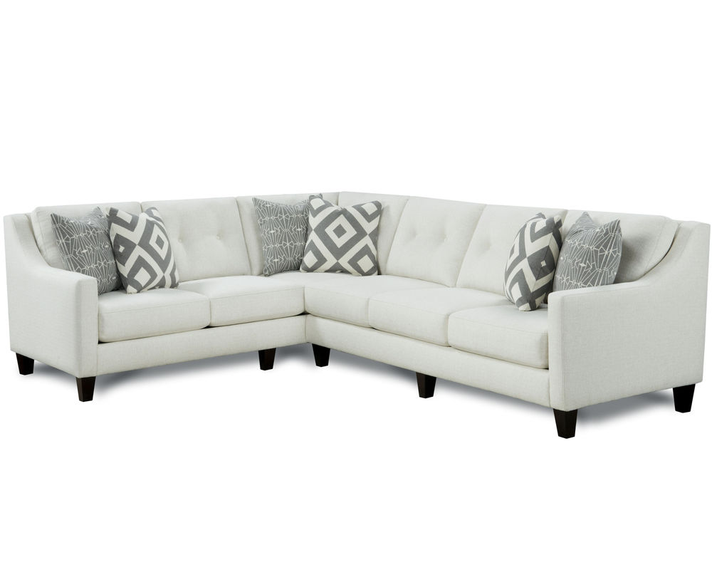 The Sugarshack Glacier Sectional is a two-piece sectional featuring a left arm facing one arm sofa along with a right arm facing loveseat with 90 degree corner unit. This collection features sloping track arms that are double welted down to a dark coffee tapered wood leg. The seat and back cushions are box border and double welted and they are all loose and reversible. Being loose and reversible, it will allow you to rotate your seat and back cushions that will not only prolong the life of the cushion inserts, but also prolong the life of the material. This sectional comes with 6 pillows in two contrasting fabrics.
