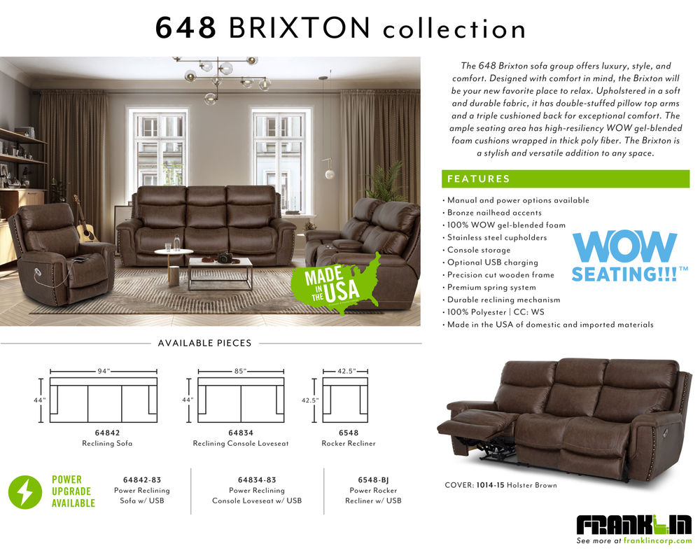The ample seating area of the Brixton 648 is designed to accommodate you and your loved ones comfortably. The high-resiliency WOW gel-blended foam cushions are wrapped in thick poly fiber, providing a plush and supportive seating experience. Say goodbye to uncomfortable and stiff recliners - the Brixton 648 is here to revolutionize your relaxation routine.