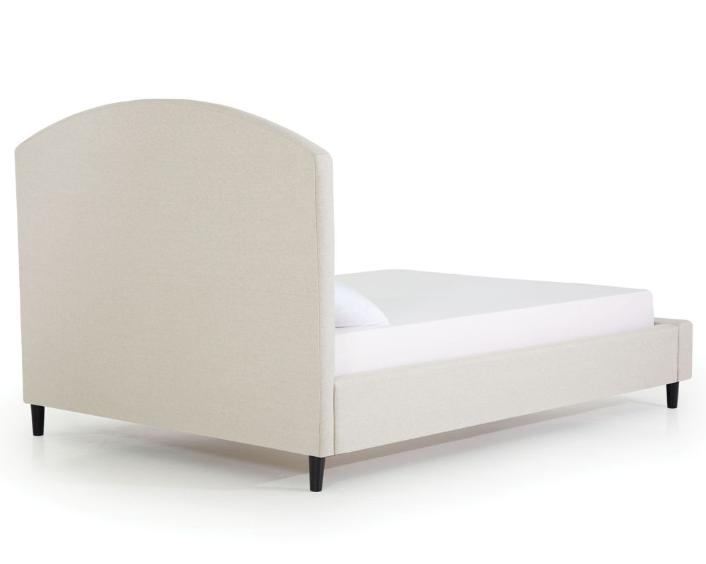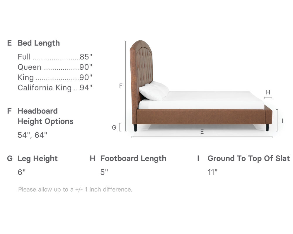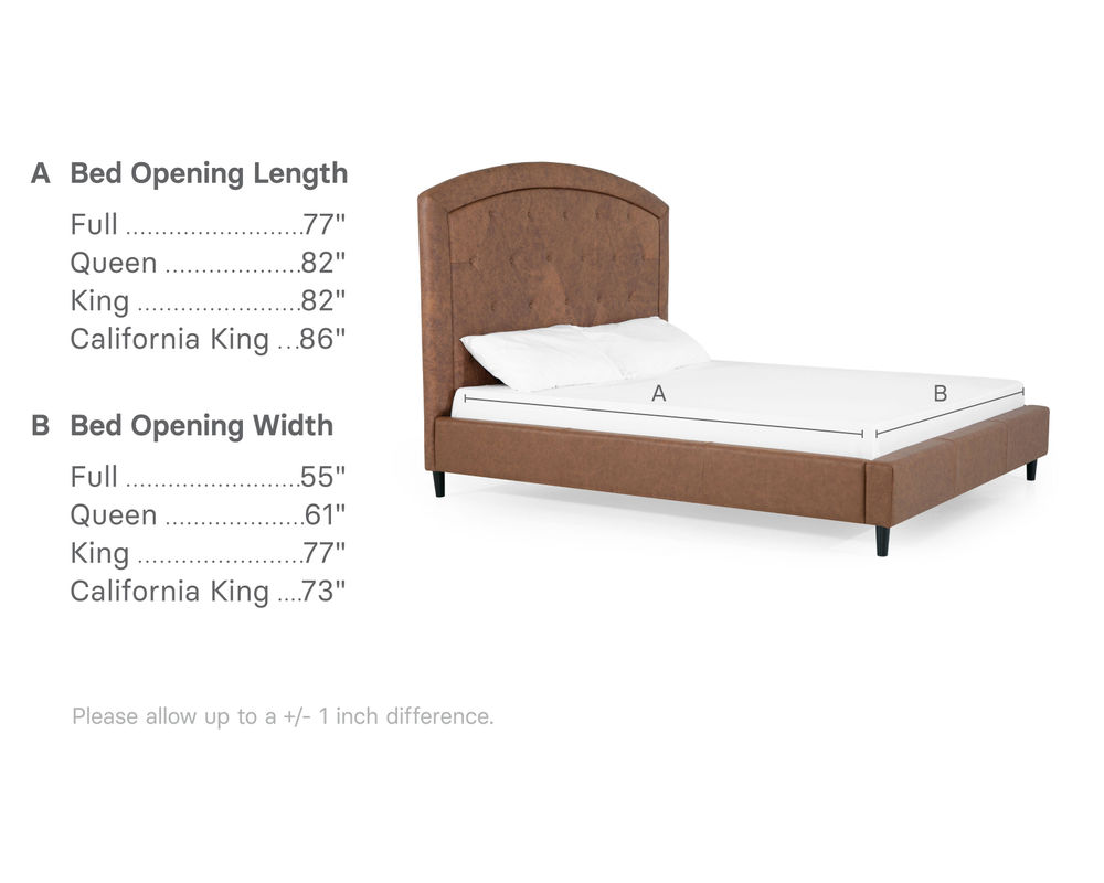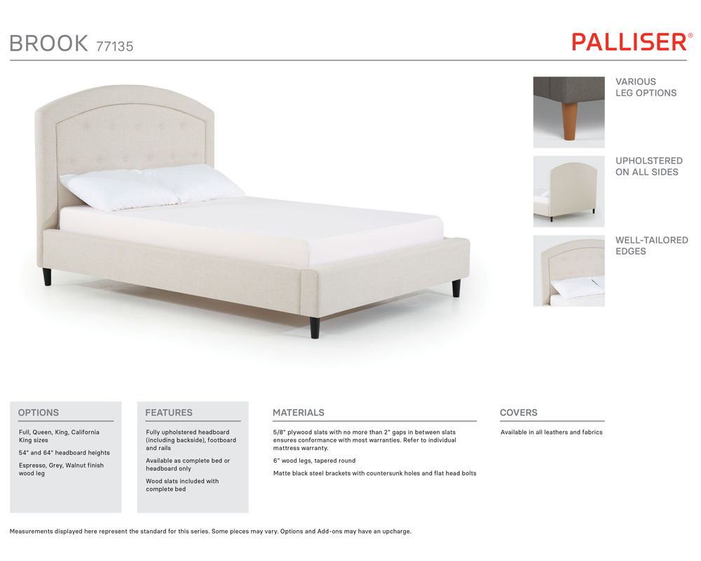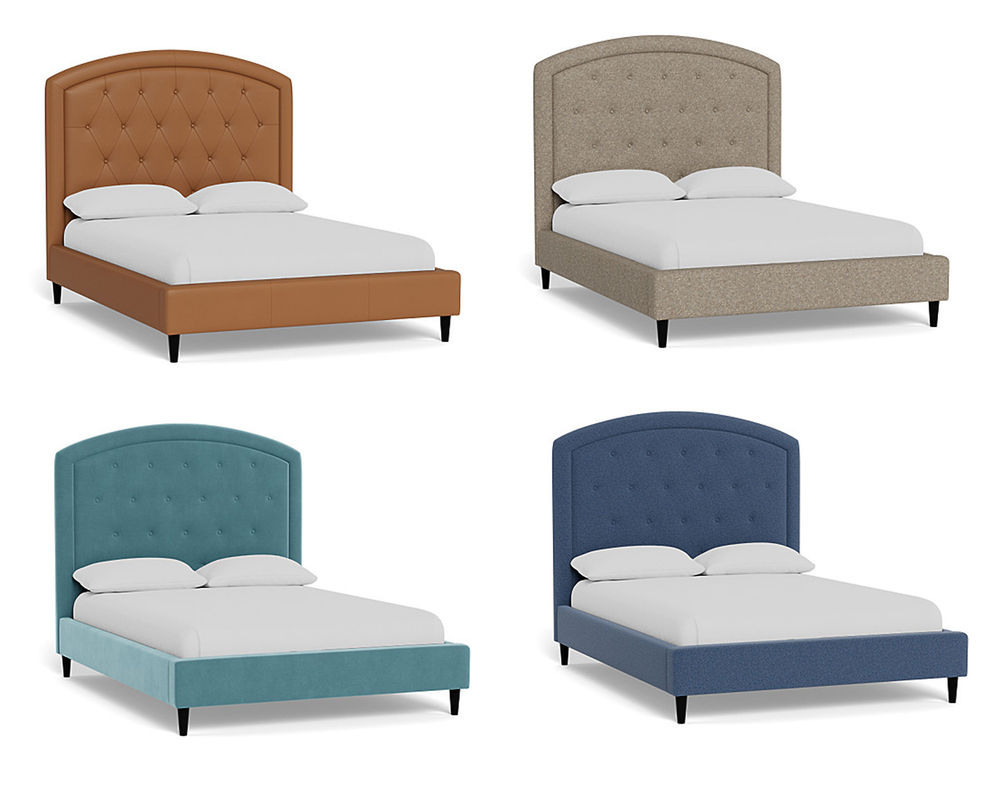 From Sofas and Sectionals.com: Subtly feminine and decidedly sophisticated, the Brook features a curved arc headboard and picture frame detail surrounding a button-tufted face. Available in 54" and 64" heights, this bed can cater to your preference and make a bold statement in any bedroom.