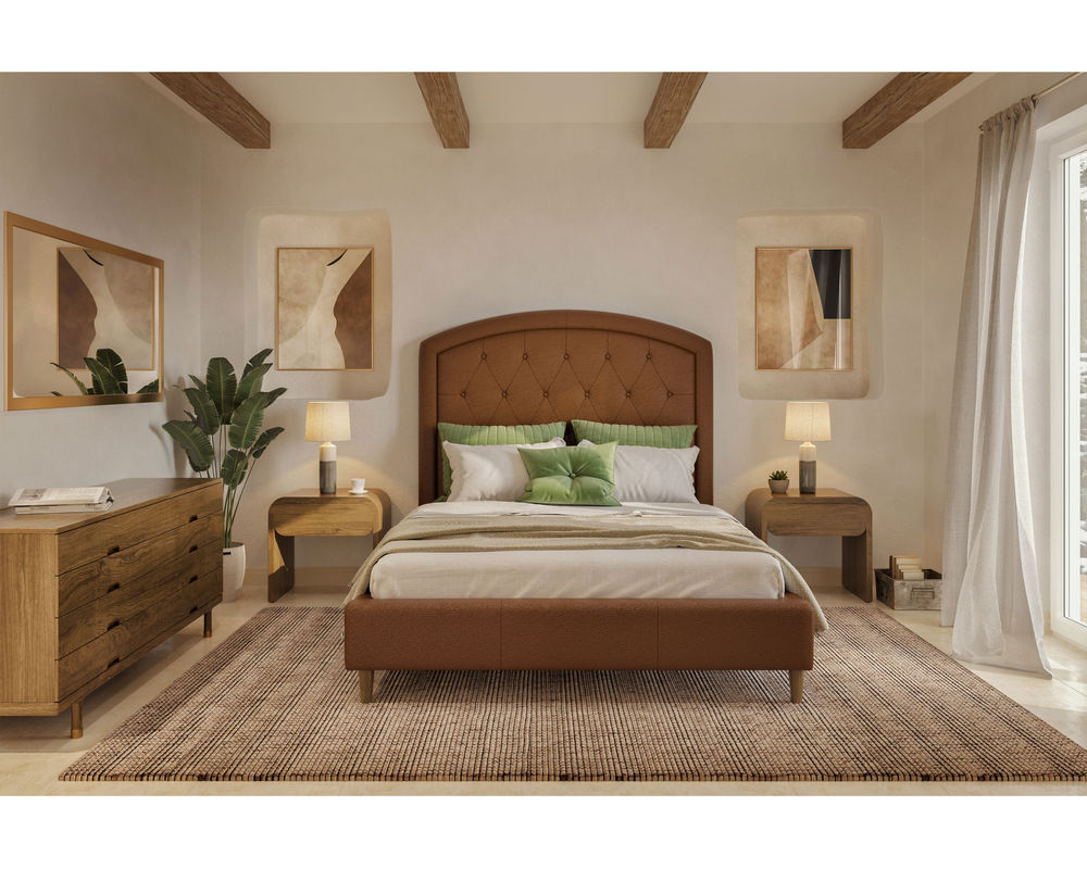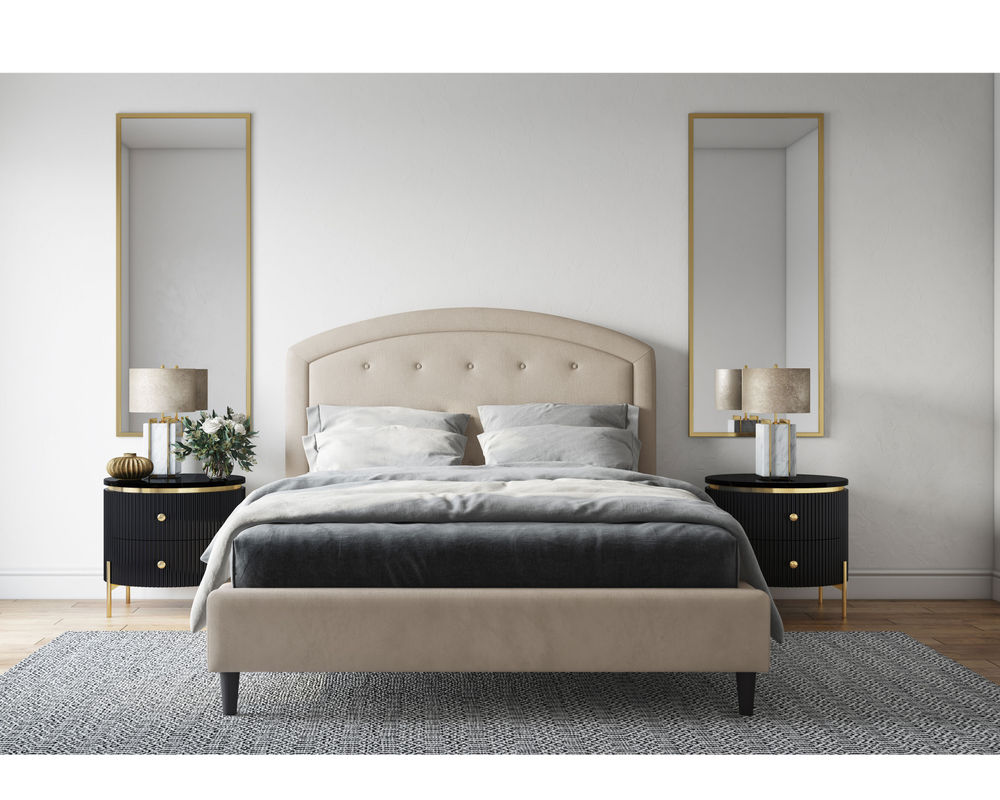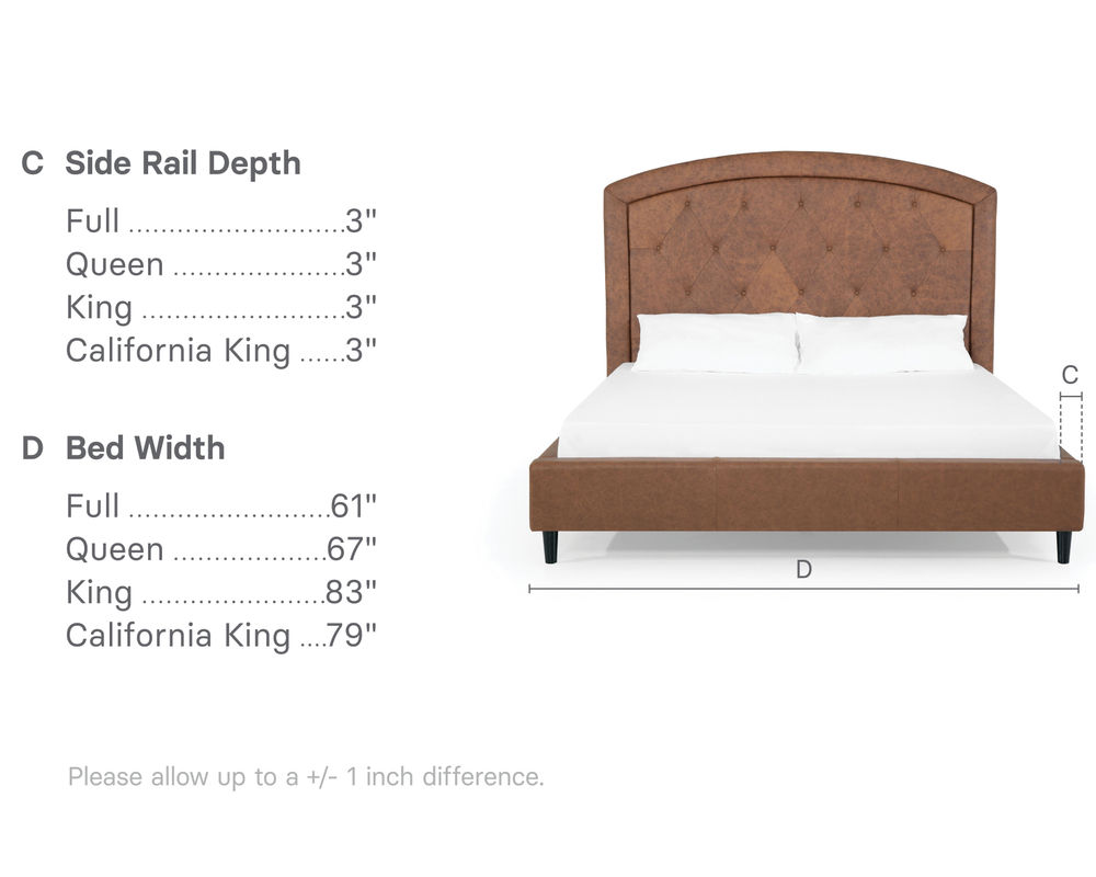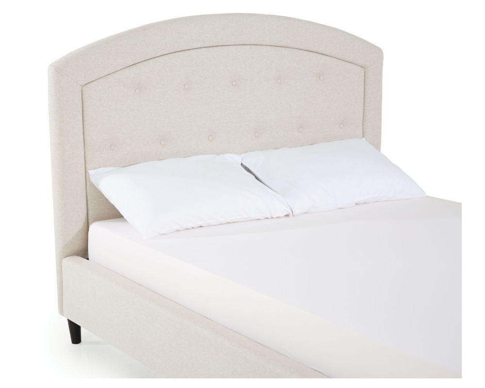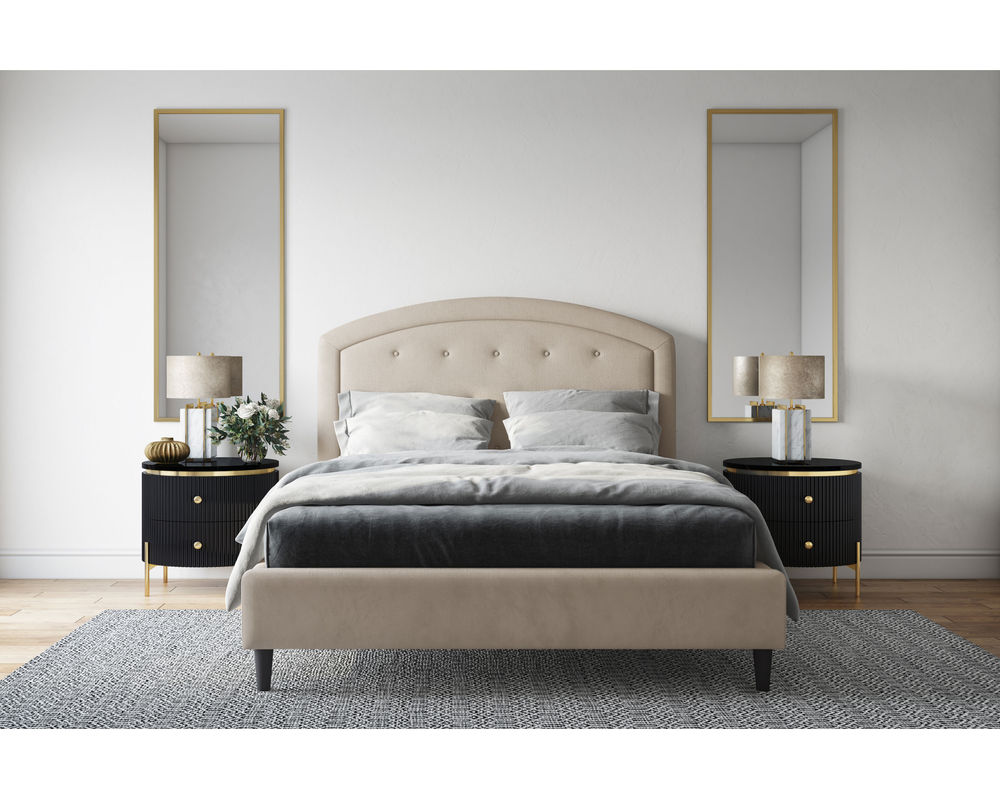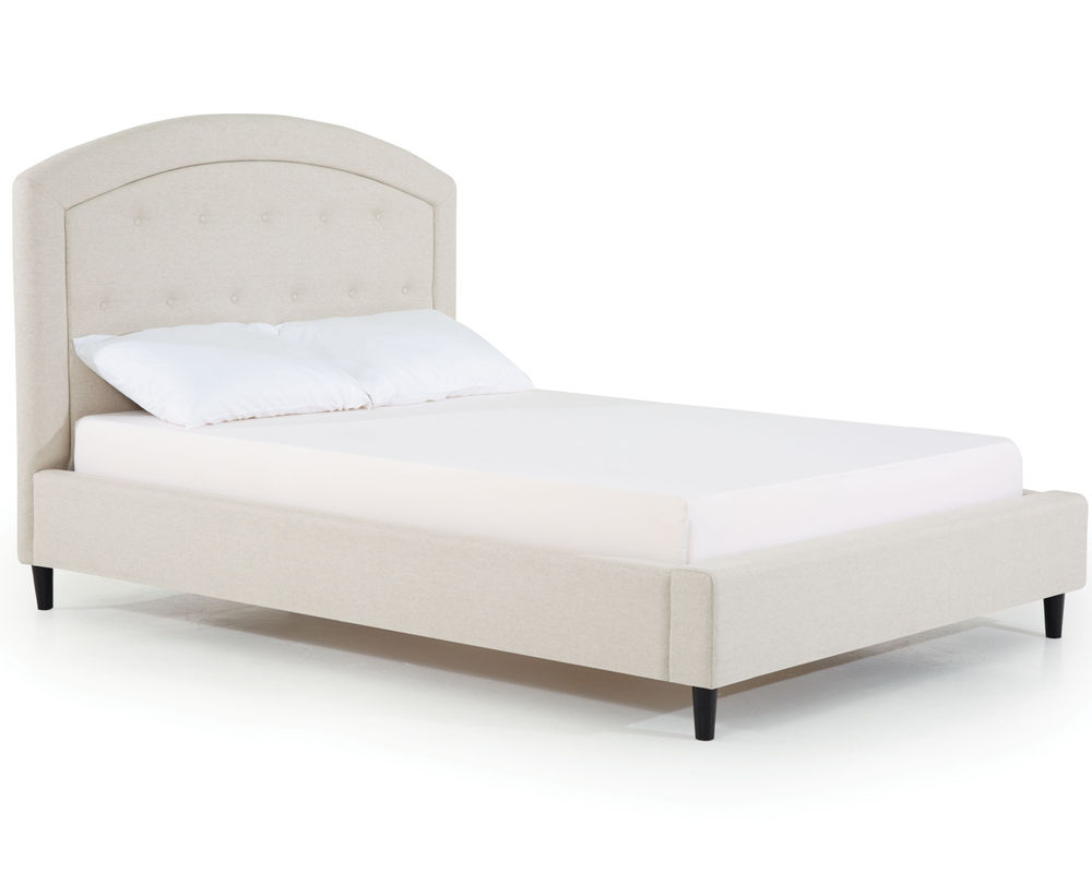 From Sofas and Sectionals.com: Subtly feminine and decidedly sophisticated, the Brook features a curved arc headboard and picture frame detail surrounding a button-tufted face. Available in 54" and 64" heights, this bed can cater to your preference and make a bold statement in any bedroom.