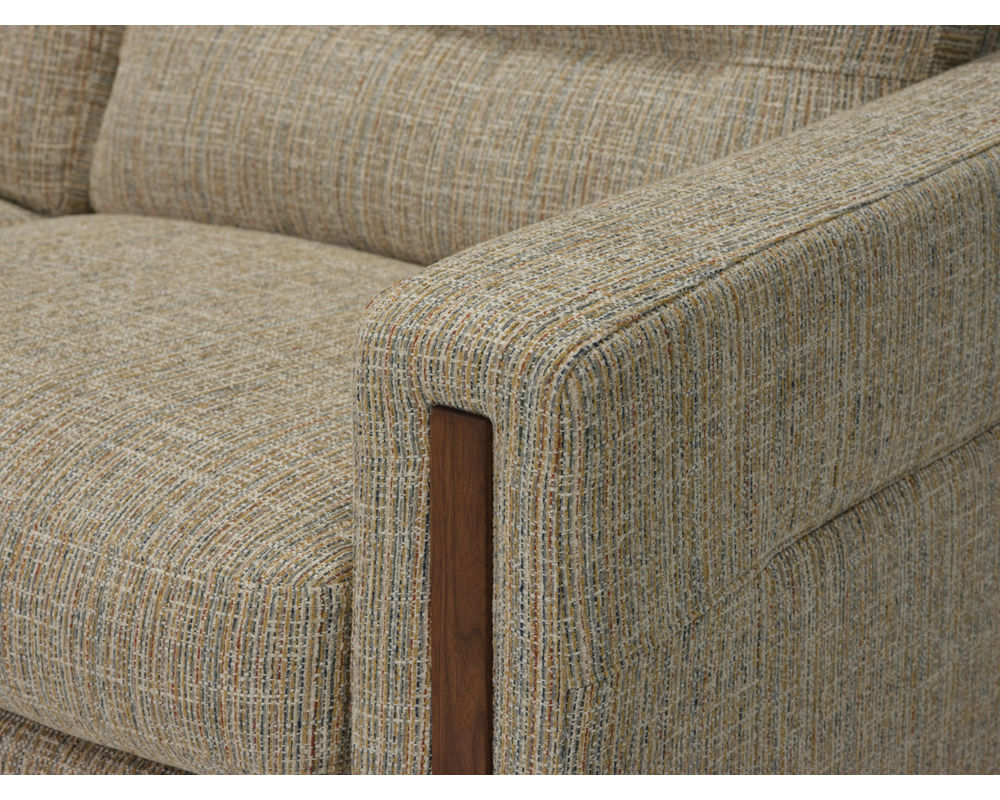 The distinctive leg design extends gracefully into the arm panel, creating a continuous architectural line that exudes strength and style. Choose from solid walnut, solid white oak, or matte black metal legs — each carefully selected to complement the tailored upholstery and precise detailing of the frame.