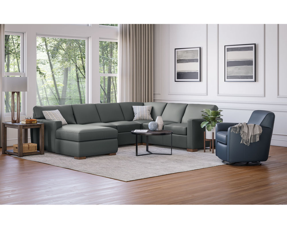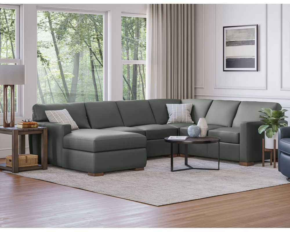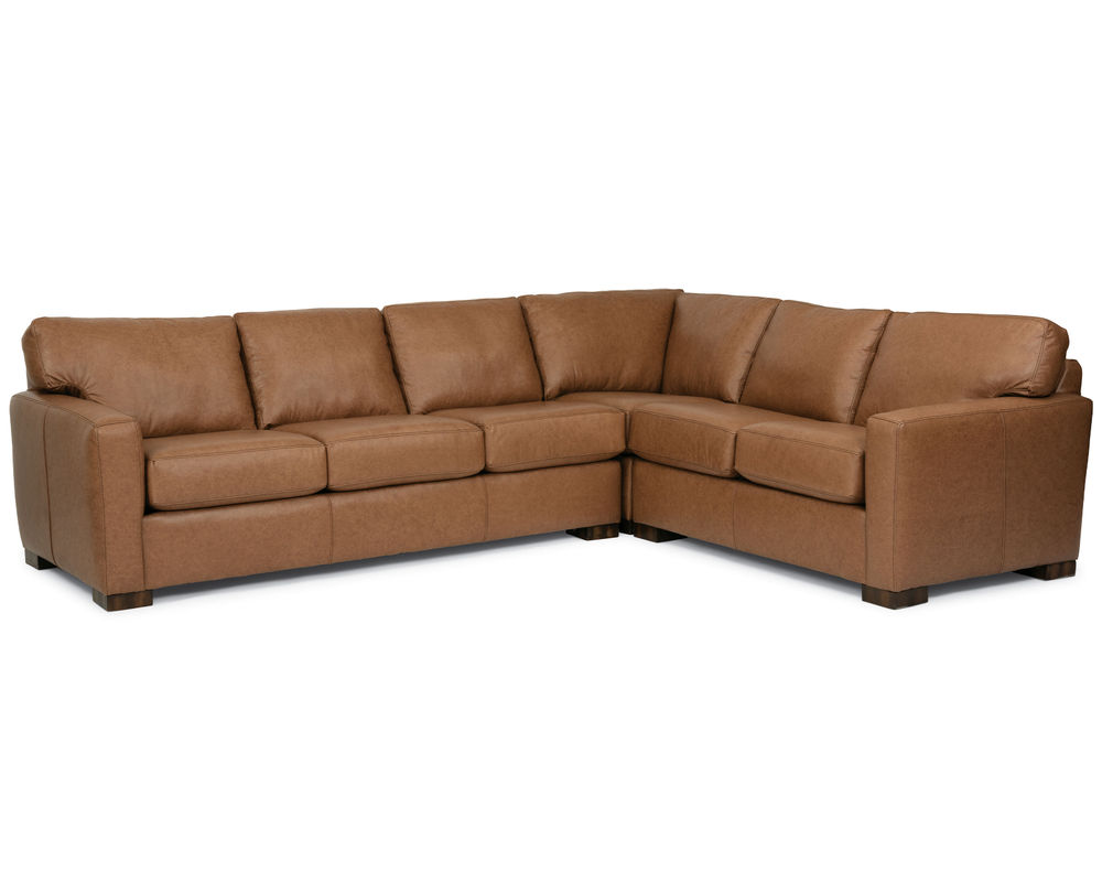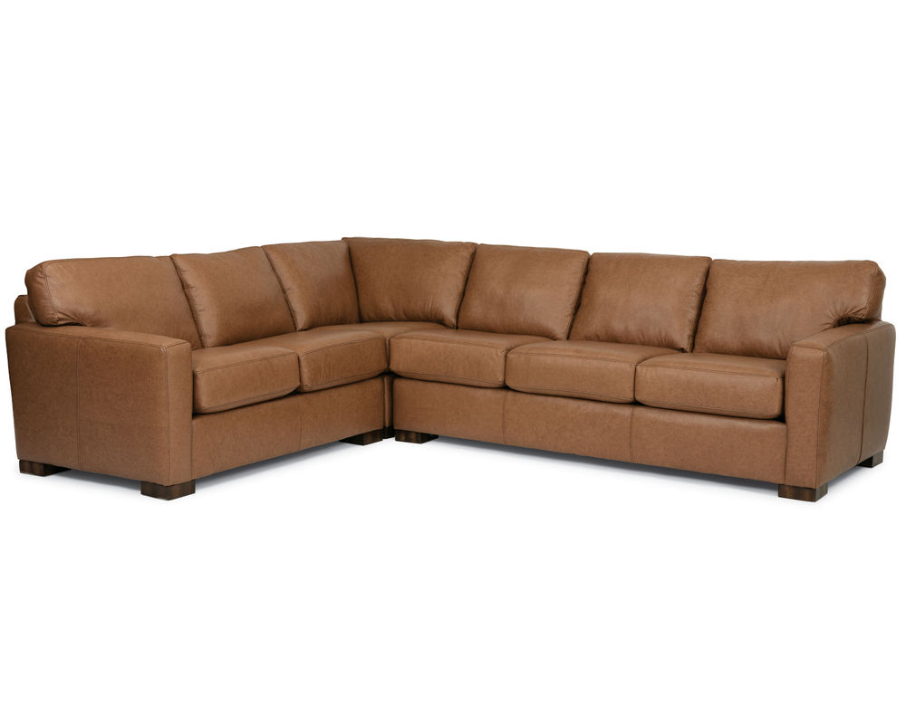Bryant offers modern, clean lines that are contrasted by its softly padded arms and boxed seat cushions. The arms and seat cushions are detailed with single-needle top stitching, while the bold block legs add a solid finish to this design. Multiple seating options make the Bryant sectional ideal for relaxing with company. Flexsteel only uses the finest leathers guaranteed to last. Over 40 leather colors to select from.