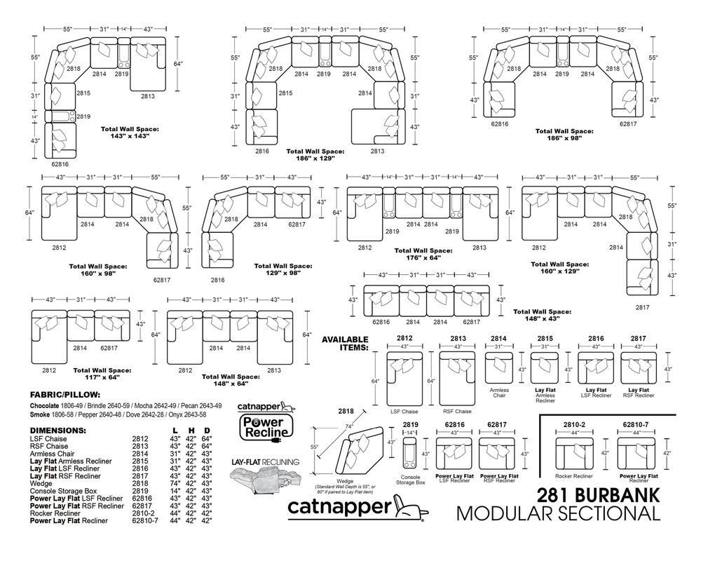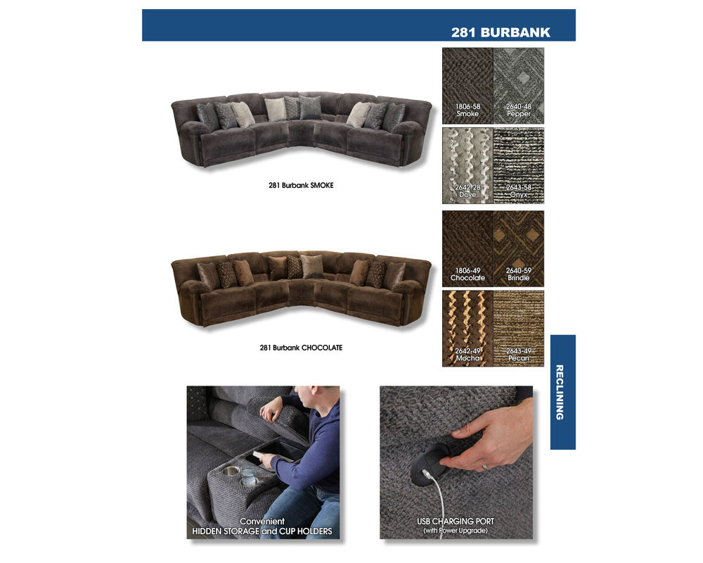 The Burbank Group is a Fully Modular Group for Ultimate Customization that Features Luxuriously Soft Chunky Polyester Fabric, Three Pattern Correlating Pillow Package, Lay Flat Reclining, and Comfort Coil Seating with Comfor-Gel.