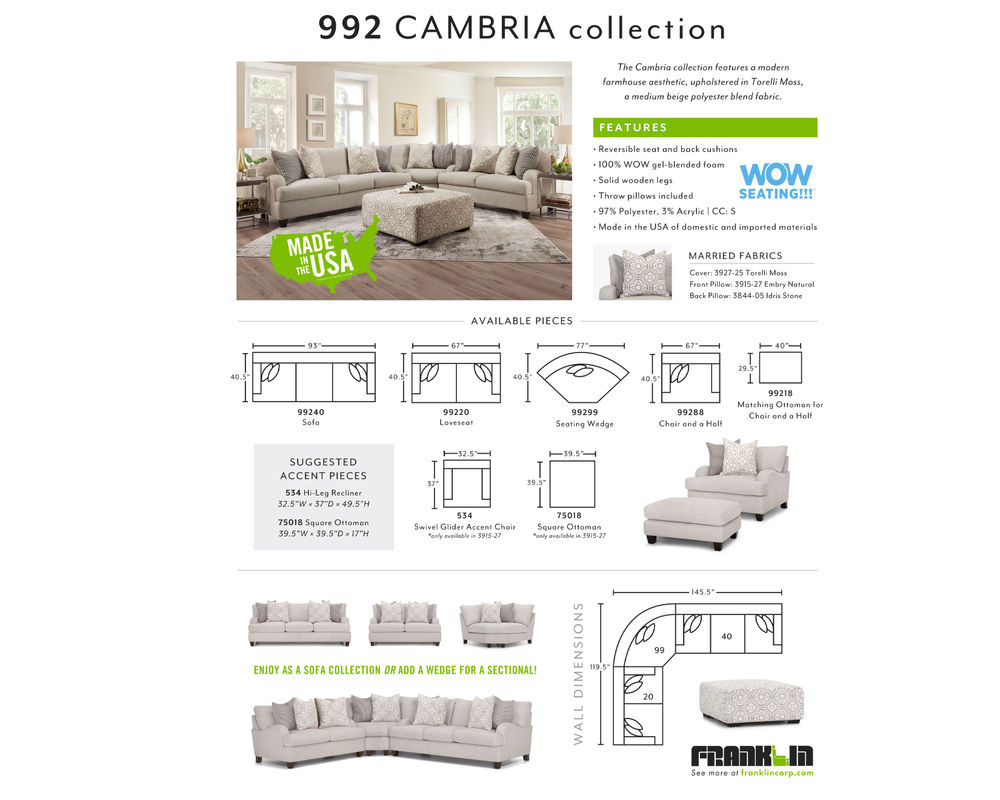 Experience the ultimate in comfort and style with the Cambria 992 Sectional. Whether you're entertaining guests or simply relaxing with your family, this sectional offers the perfect combination of functionality and design. Upgrade your living room with the Cambria 992 Sectional and transform it into a cozy and stylish haven.