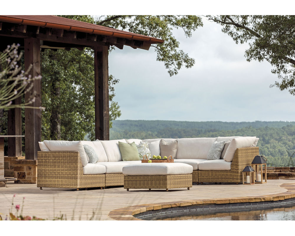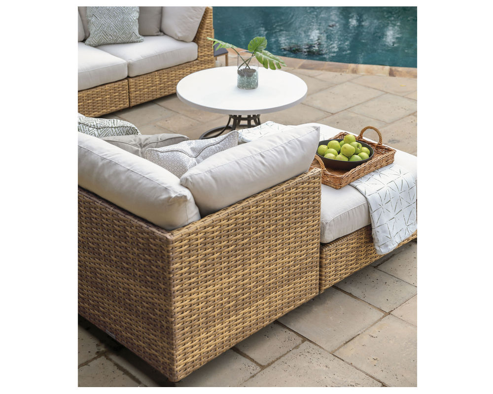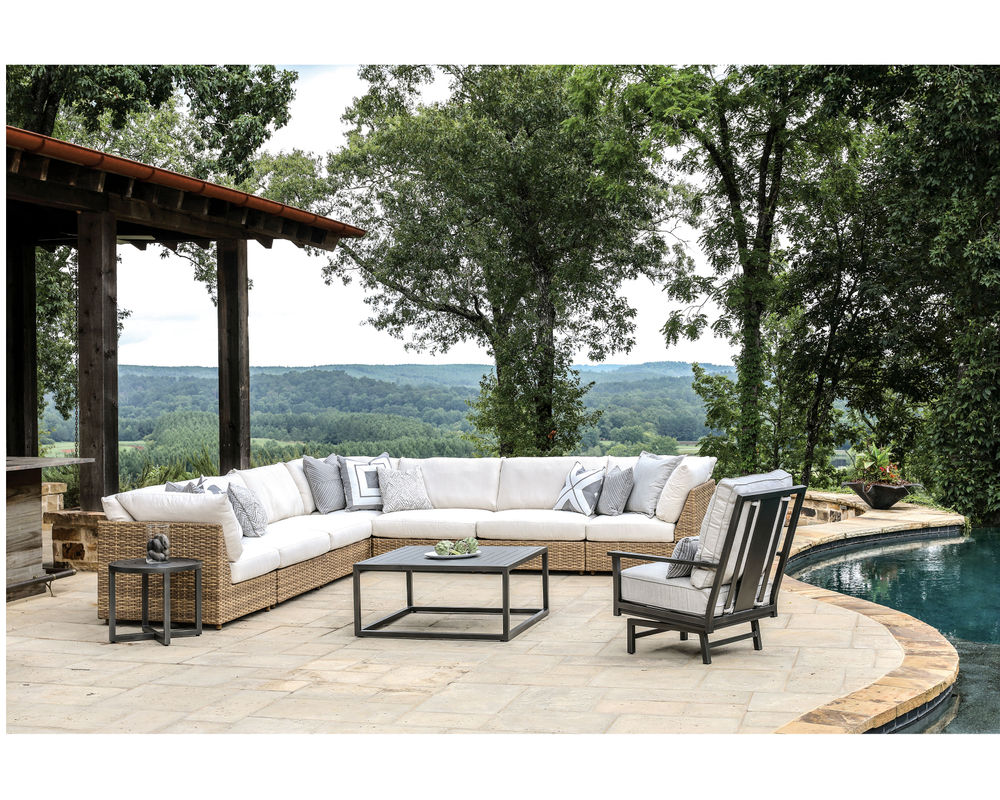 • Weather-resistant, high UV polyethylene synthetic fiber, hand-woven over premium aluminum frame. • FEATURES: Double wall construction. Clean lines, modern modularity with deep seating comfort. • CUSHION CORE: Fiber coil construction with drainable mesh on bottom. CUSHION STYLE: Box-border, weltless with top-stitch tailoring. • Available in all LANE VENTURE fabrics. • Available in finish 650 Barley, as shown.