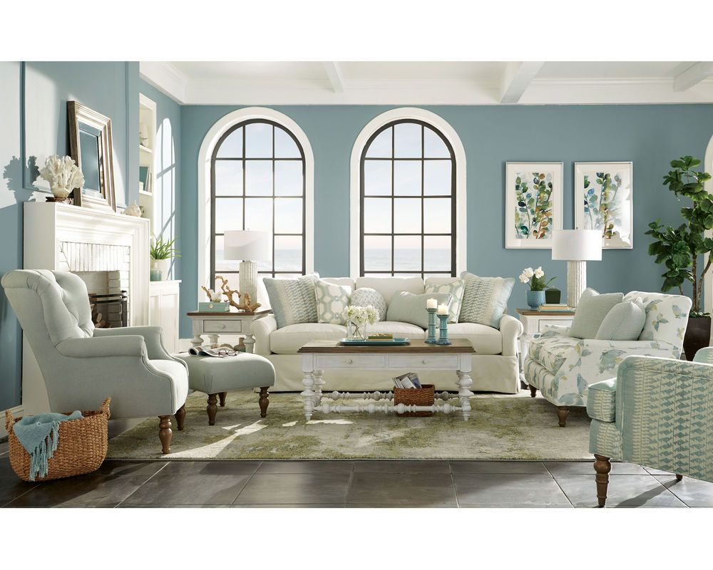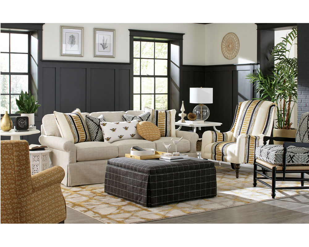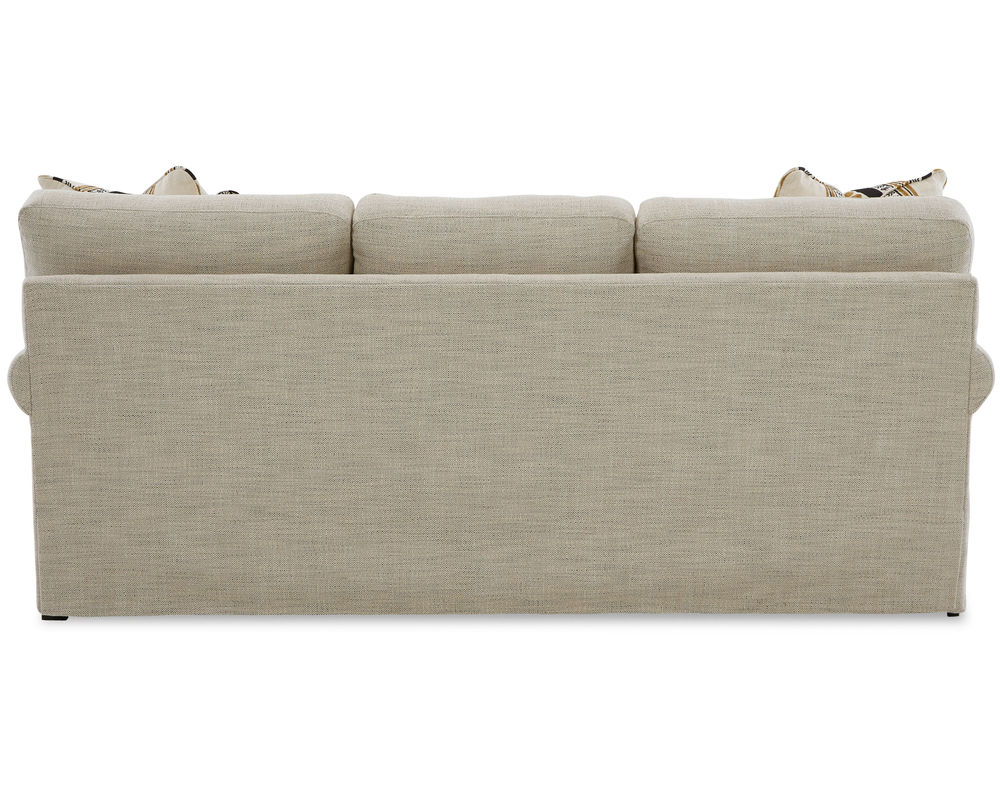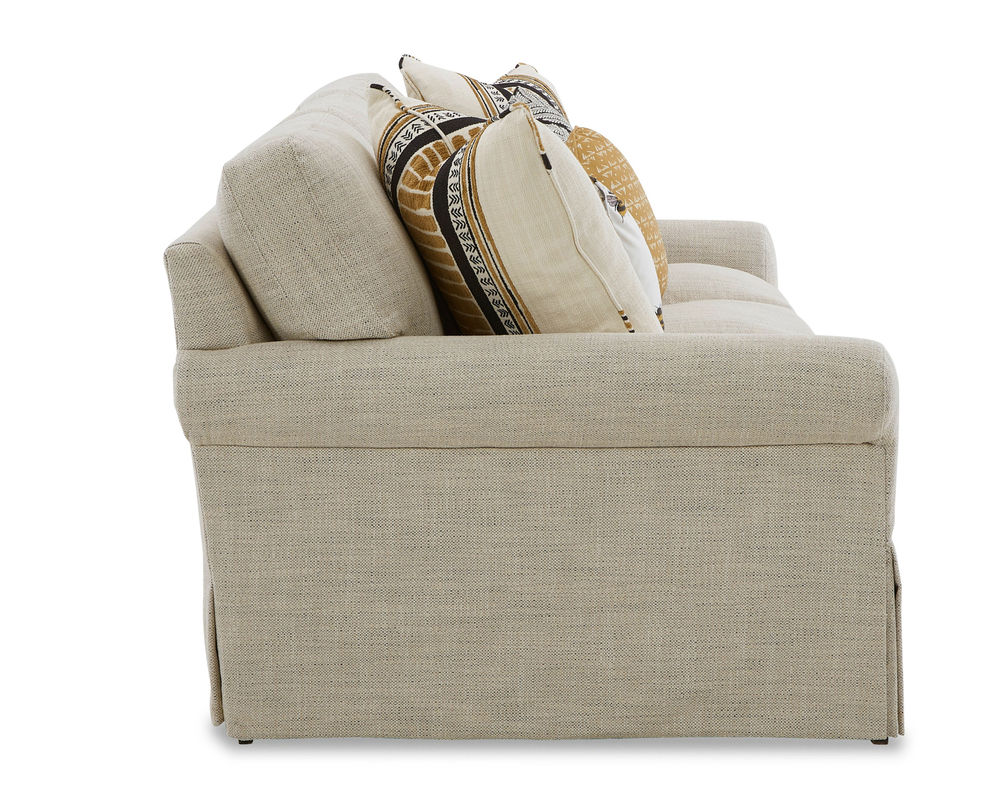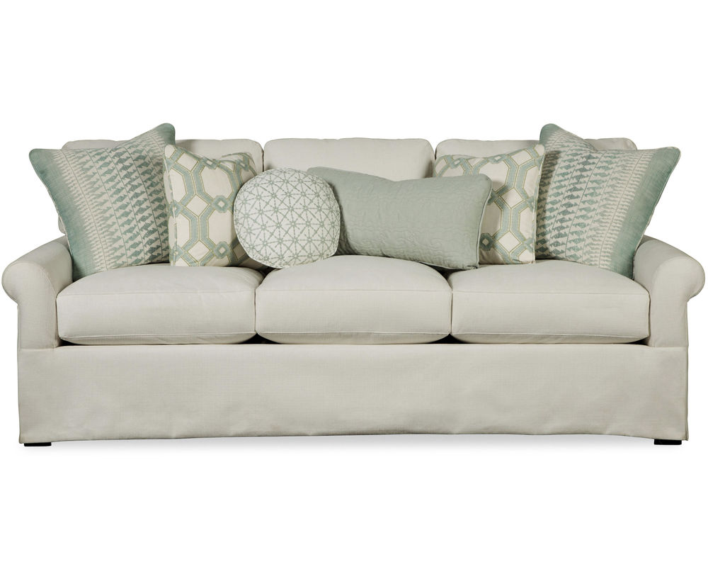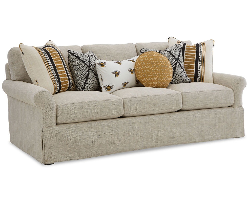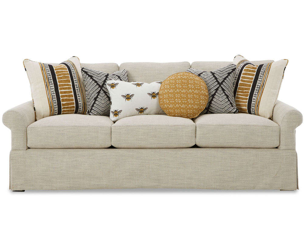 Clean and casual, this faux slipcover sofa is an easy way to bring softness and beauty to your home. It features cloud-soft seating- Paula's exclusive Down Blend cushion- for the ultimate in comfort and durability. French seaming and a dressmaker skirt give a carefree, easy-to-live with look. Included are 6 accent pillows in various shapes and sizes, ready to customize in any fabric you select! Also available are the matching loveseat, chair and ottoman. Over 100 High Performance fabrics available.