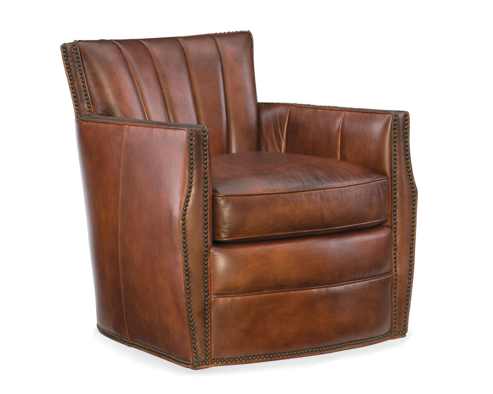 A fan-shaped back with vertical channeling and shaped arms accented by nailhead trim distinguish the timeless yet modern Carson Swivel Club Chair. The chair is covered in the authentic and inviting aniline top grain hand-wiped Checkmate Pawn leather.