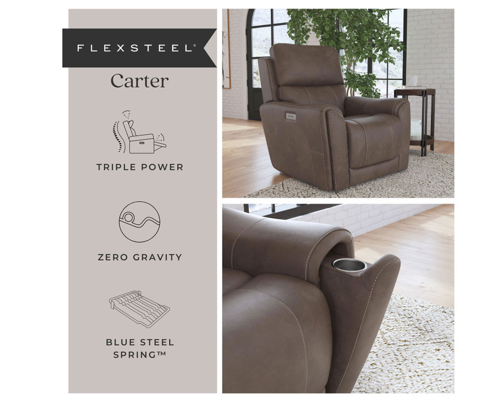Introducing the ultimate relaxation experience with the Carter 1587 Recliner. This luxurious piece is equipped with triple power and our Zero Gravity mechanism, allowing you to customize your recline, headrest, and lumbar support fully. You can even recline to a zero-gravity position for a weightless and incredibly comfortable feel.