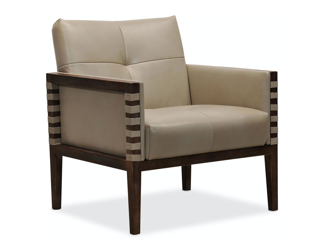 Striking, modern and timeless, the Carverdale Leather Club Chair has a wood frame and legs in a dark hickory finish contrasting with the Maddie Taupe hand-wiped semi-aniline top grain upholstered leather seat and back. Designer details include a single button tufted back and seat and leather strips wrapped around the top of the wood arms on the front and back.
