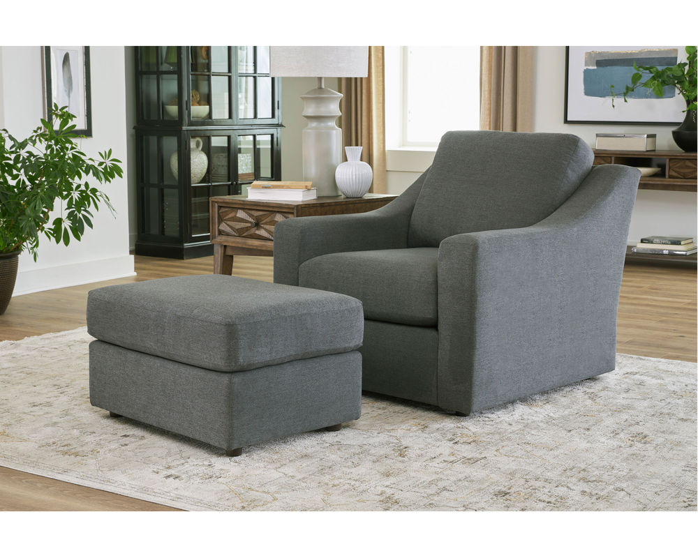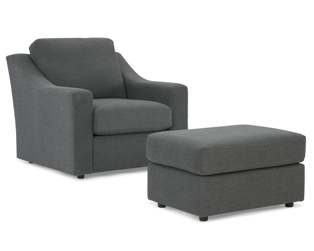 The bottom of the chair features a zipper access, allowing you to adjust the pillow fiber to your desired comfort level. With over 100 fabric options available, you can customize the chair to your own unique style. The matching ottoman allows you to put your feet up and relax, or you can complete your living room with the sofa and loveseat from the same collection.