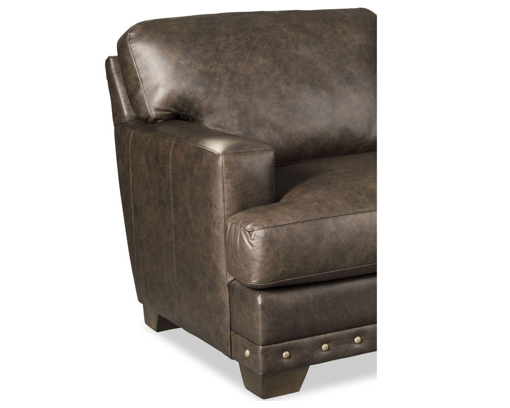 This Harrison 7827 Leather Chair is the perfect combination of style and comfort. It features an architectural design with bold nail head detailing, creating a casual, yet sophisticated look. With its generous size of 100'', it will provide plenty of room to relax in. It also includes semi-attached backs, Blend Down Coil cushions, and track arms, offering you a plush and cozy seating experience. You can choose from the matching loveseat, chair 1/2, and ottoman to complete your living room, and if the nail head trim isn't your style, you can opt for the plain version. The chair is made with 100% top-grain leather, making it durable and high-quality. If you're looking for a chair that is stylish and comfortable, this Harrison Leather Chair is the perfect choice.