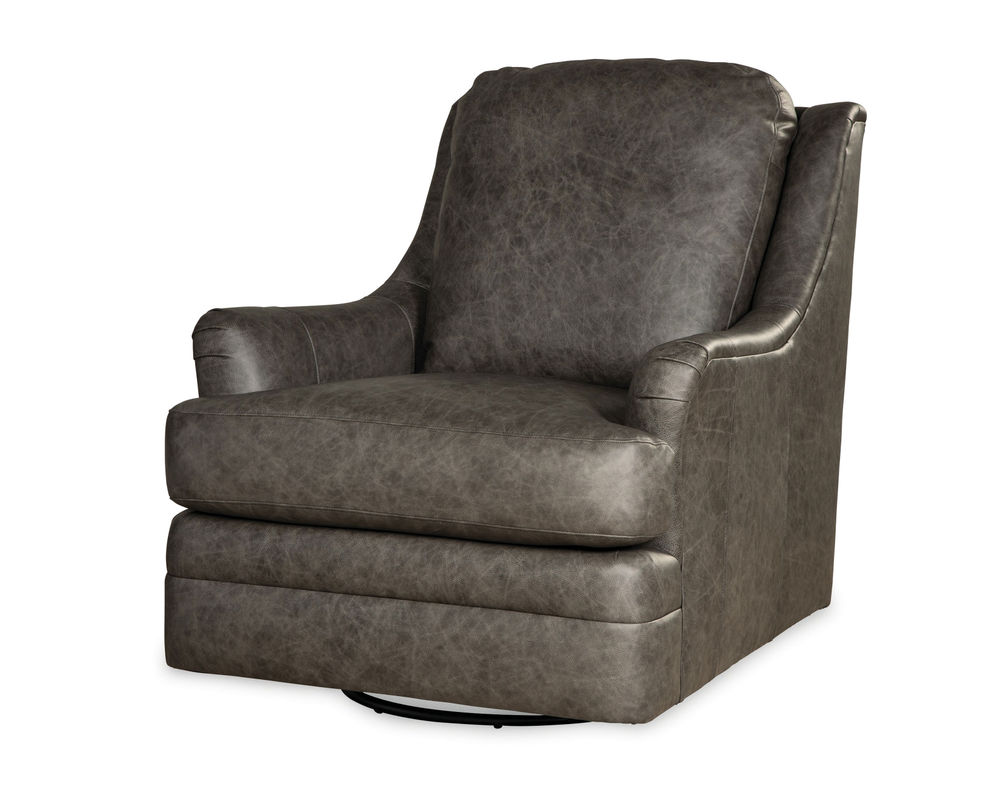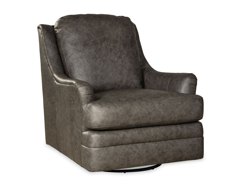 A modern leather swivel chair that feels at home in both contemporary and casual settings. It features a Blend Down Coil cushion, track arms, and an attached box border back with French seaming. Generously scaled and exceedingly comfortable.