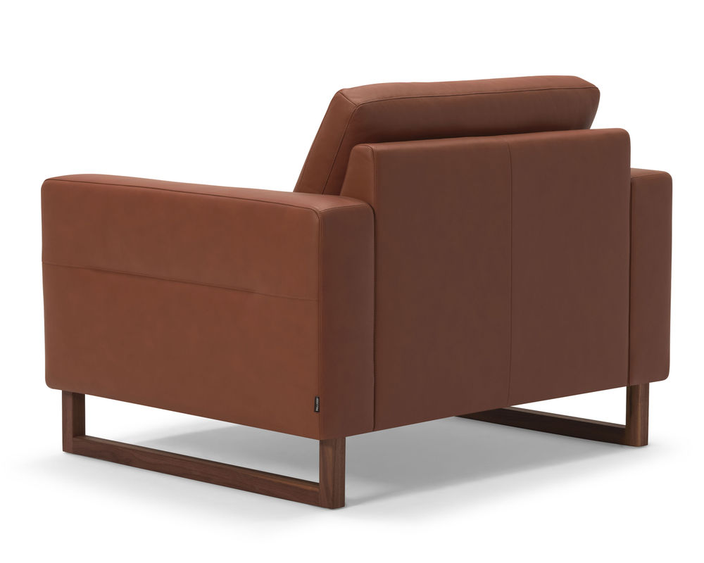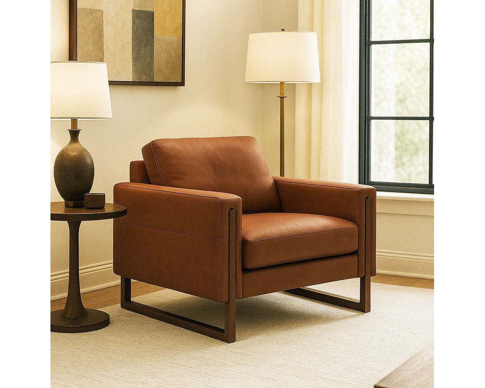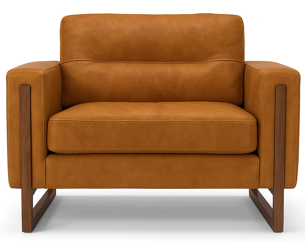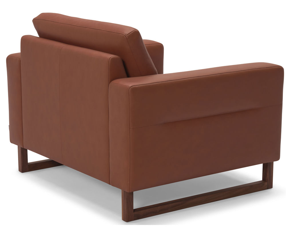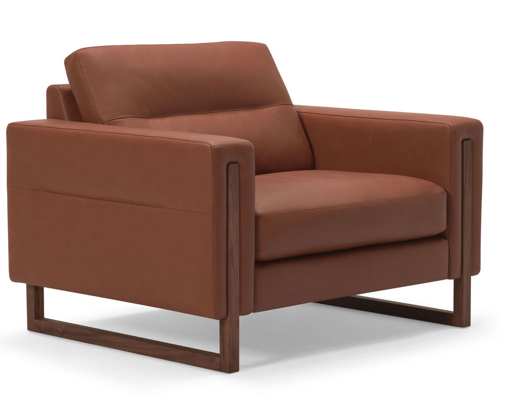 Introducing the stunning Brookes 77696 Leather Chair, a perfect blend of luxurious fabric and elegant wood design. This modern sofa features pleated back cushions and sides, adding a touch of sophistication to any room. The chair stands on gorgeous wood trim legs and base, available in your choice of two metal and three wood finishes to match your style.