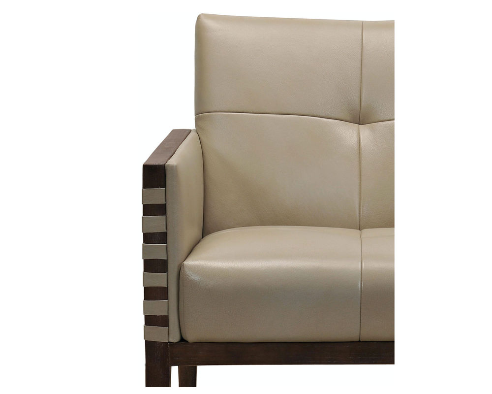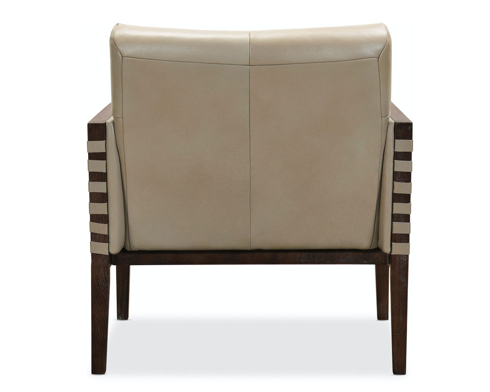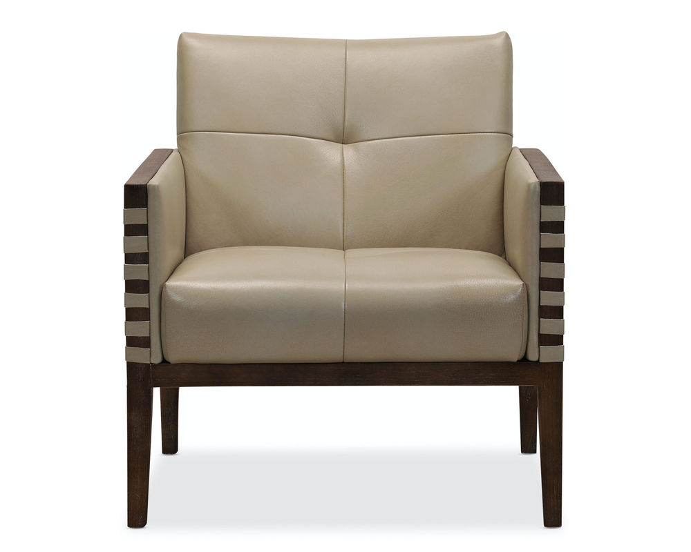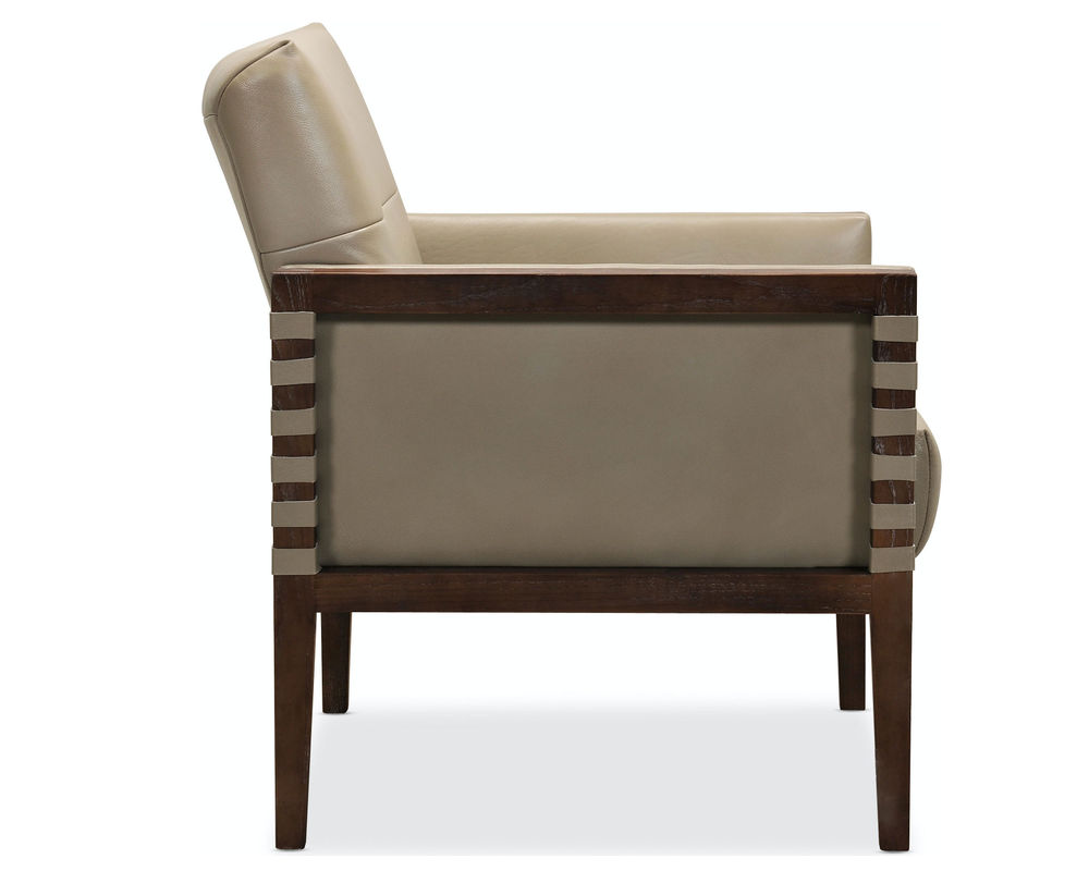 Striking, modern and timeless, the Carverdale Leather Club Chair has a wood frame and legs in a dark hickory finish contrasting with the Maddie Taupe hand-wiped semi-aniline top grain upholstered leather seat and back. Designer details include a single button tufted back and seat and leather strips wrapped around the top of the wood arms on the front and back.