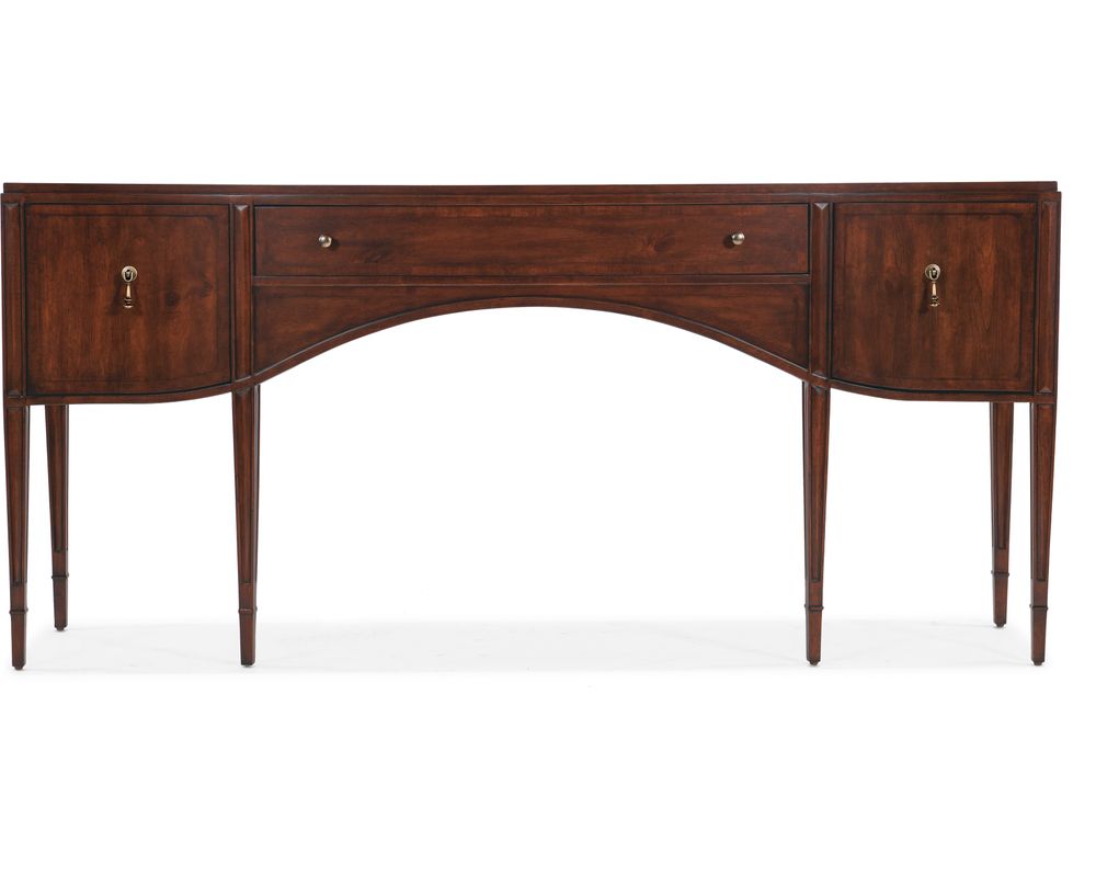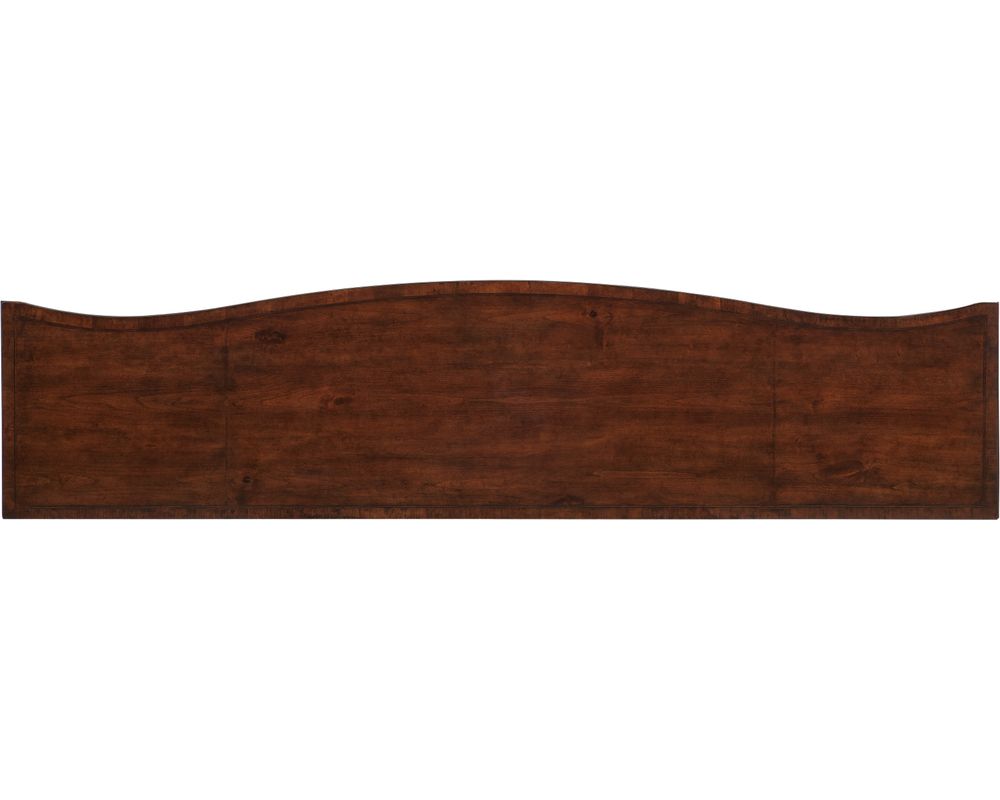 With its Maraschino Cherry finish, this console table showcases the natural grain of the cherry veneers, highlighting the cathedral structure and the selective inclusion of knots for a unique and rich appearance. The antique bronze pendant and round pull add a touch of elegance and complete the overall traditional look of this piece.