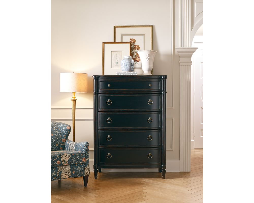 From Sofas and Sectionals.com: Introducing the Charleston Five-Drawer Chest, a stunning addition to any bedroom with its traditional style and functional features. This chest is crafted from high-quality materials, including cherry veneers, cedar, resin, metal, and solid-wood edge top, ensuring durability and longevity.