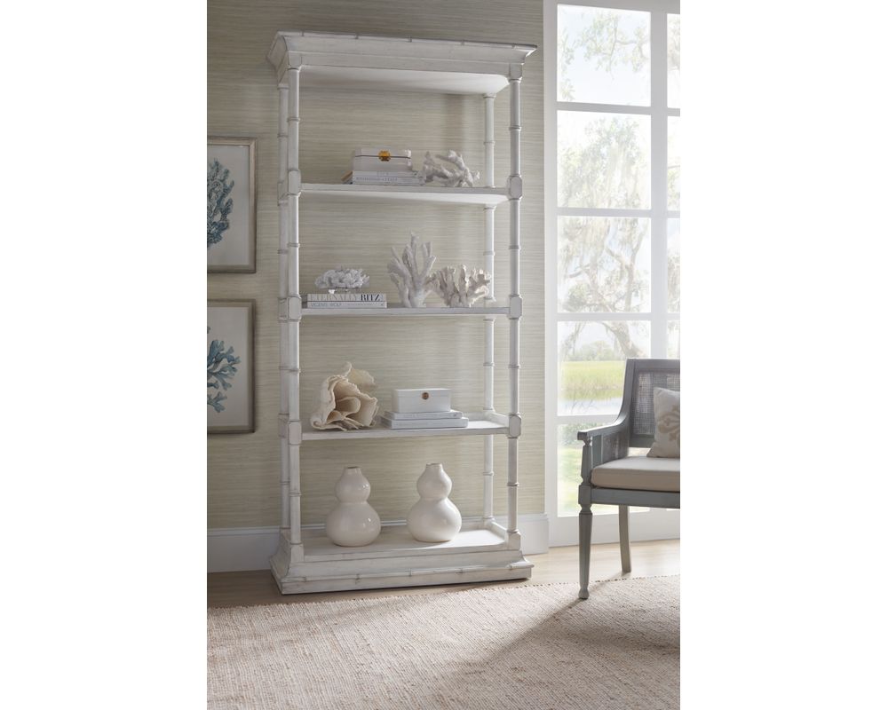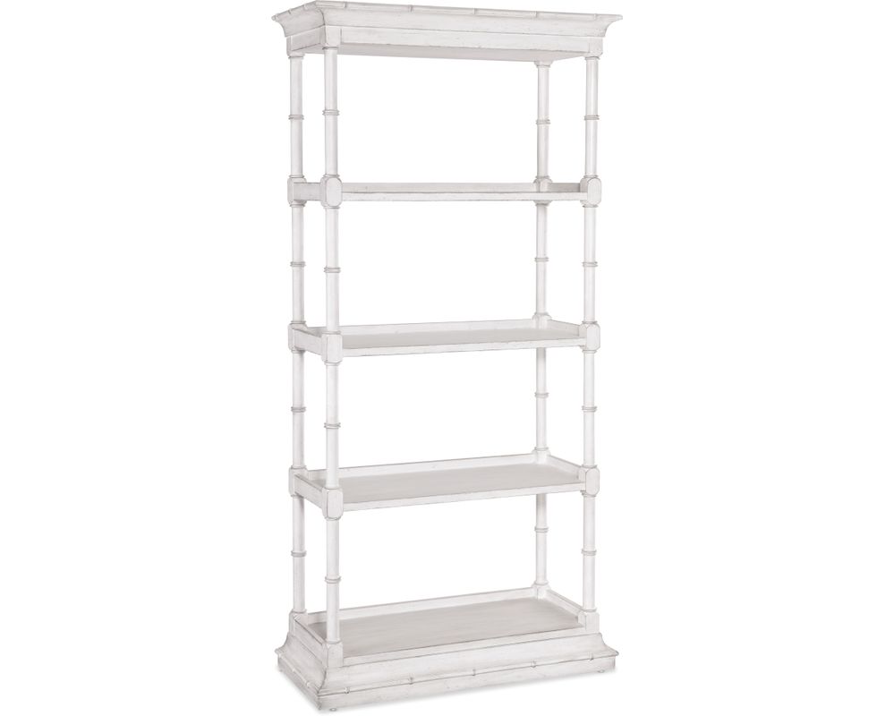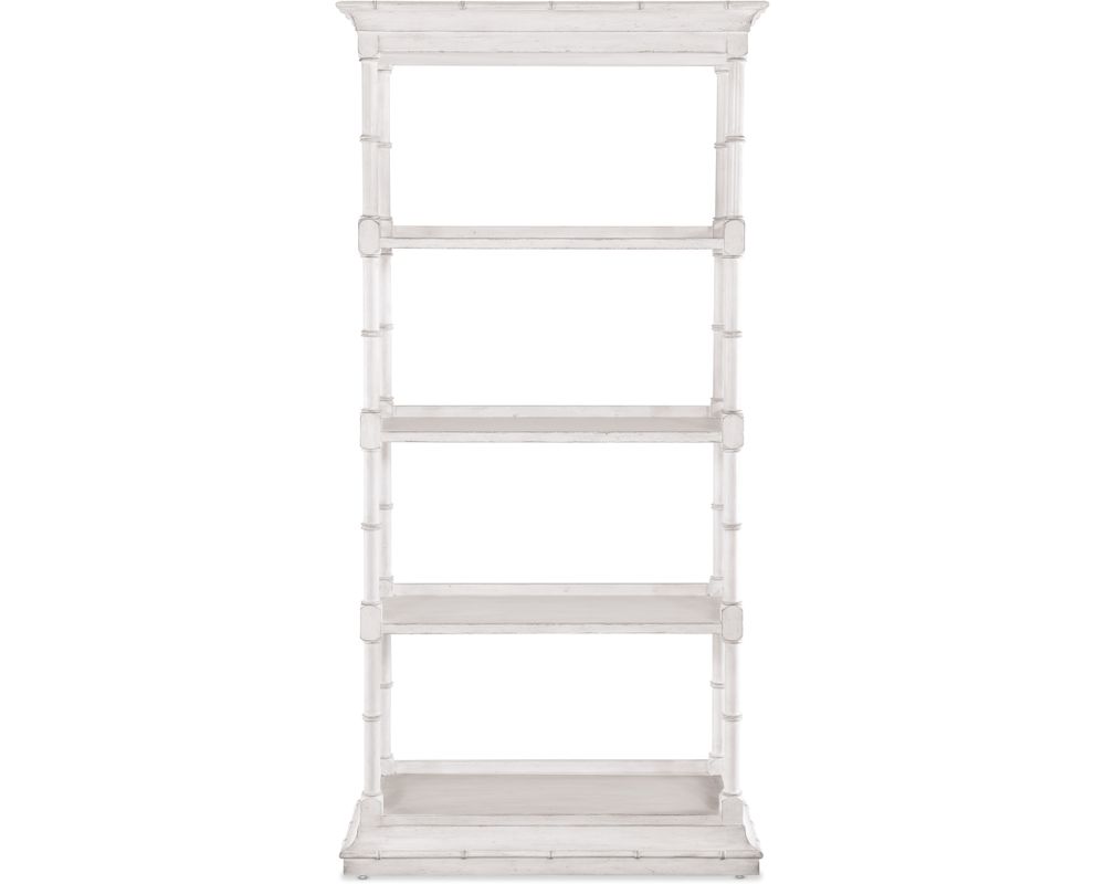 The etagere is finished in White Heron, a beautiful and softer interpretation of the classic Southern limestone white. It also has a slightly brighter sheen, giving it a more modern and sophisticated look. This heirloom-quality finish adds a touch of luxury to your living space.