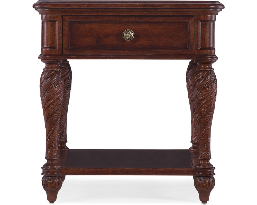 A standout feature of this end table is the intricately carved leaf motif on its legs. This adds a touch of sophistication and charm to the overall design. The table is crafted from cherry veneers and walnut inlay, with a solid-wood edge top and resin for added durability and strength. The dark wood finish gives the table a rich and luxurious look, making it a statement piece in any room.
