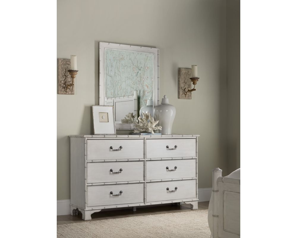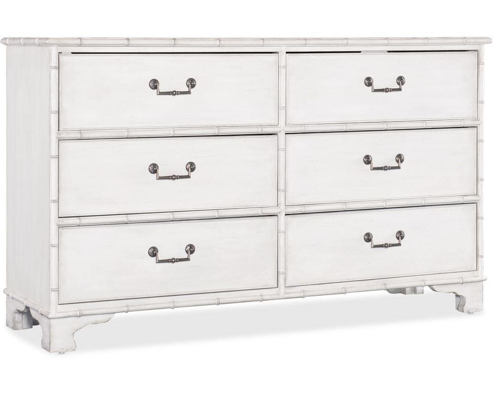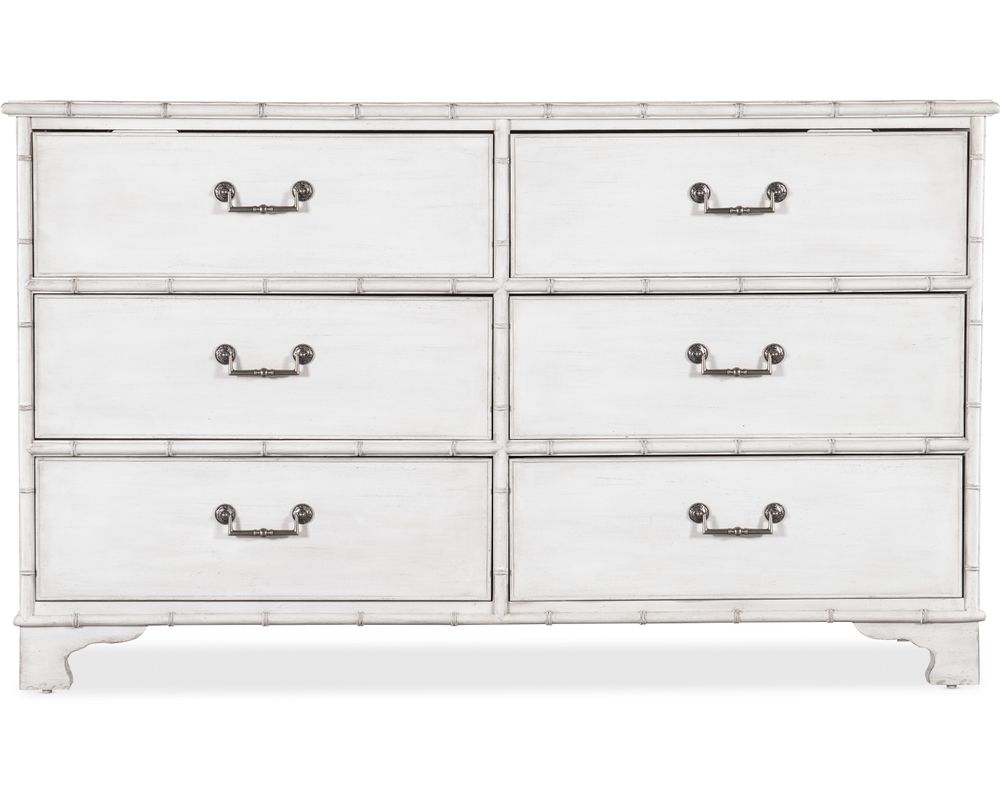 From Sofas and Sectionals.com: Introducing the Charleston Six-Drawer Dresser, a stunning piece of furniture inspired by the tropical craftsmanship of the West Indies and the classic British and Dutch Colonial design periods. This dresser features a beautiful bamboo motif trim and six spacious drawers with self-closing drawer guides, providing ample storage space for clothing and other belongings.
