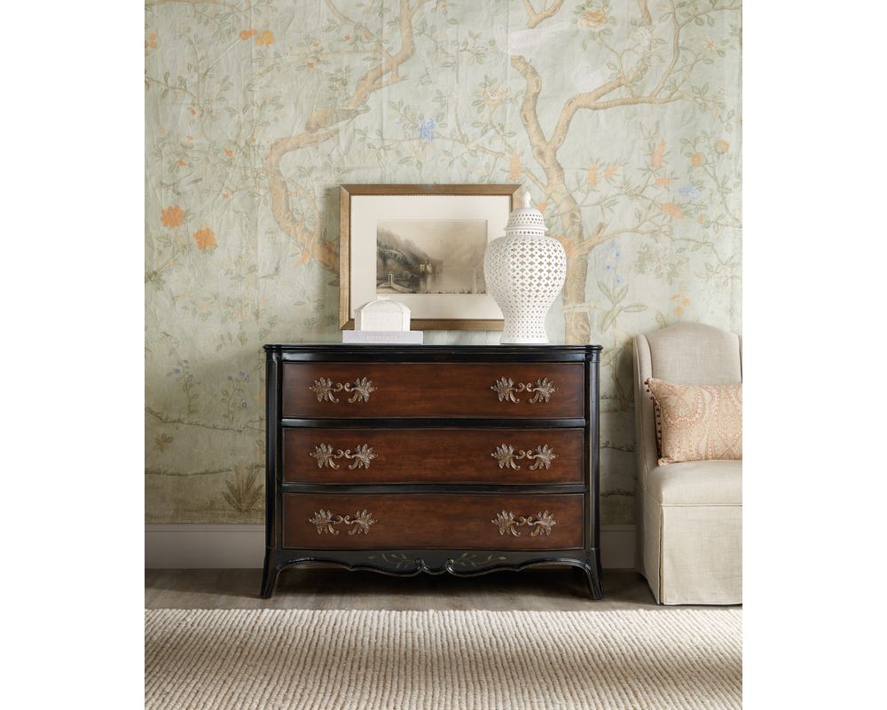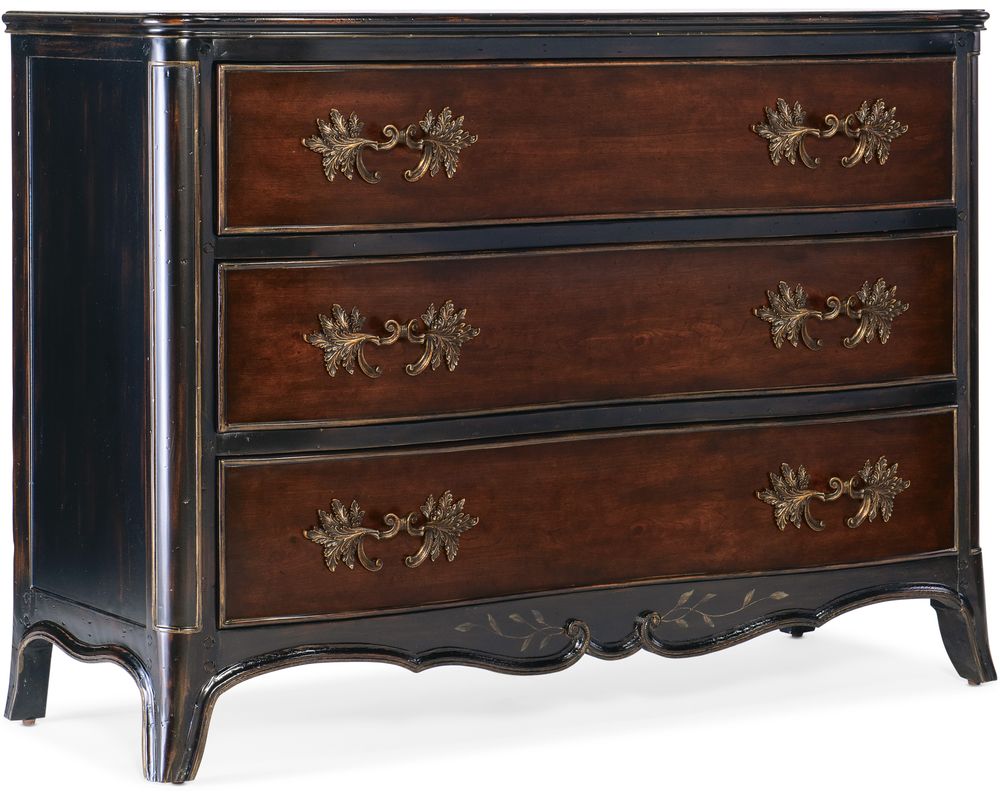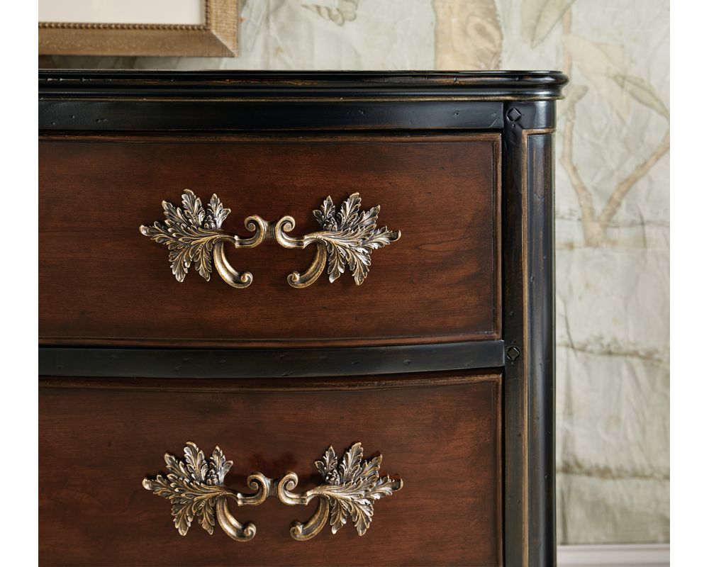 In addition, the handpainted accents on the shaped bottom apron add a charming touch to the chest. The custom decorative pulls feature an antique bronze color, adding to the piece's luxurious feel.