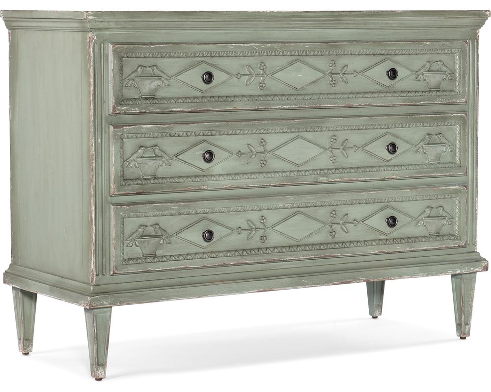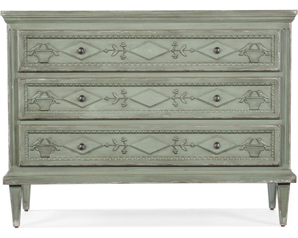 The carved drawer fronts feature a charming bird, floral, and diamond motif, adding a whimsy and sophistication. The chest is also equipped with levelers, ensuring stability on any surface. The tapered legs add a touch of elegance and lend a traditional feel to the overall design.