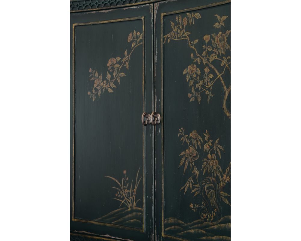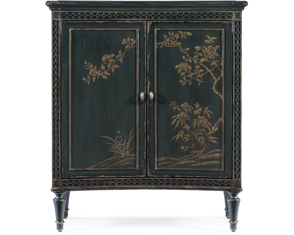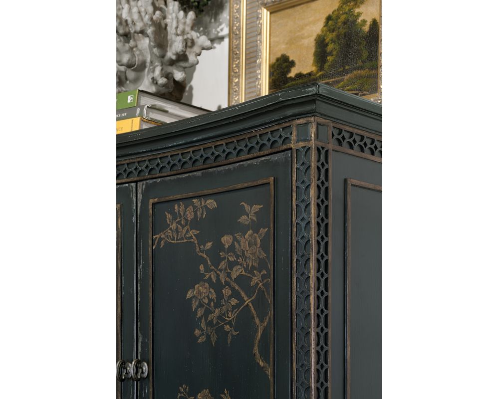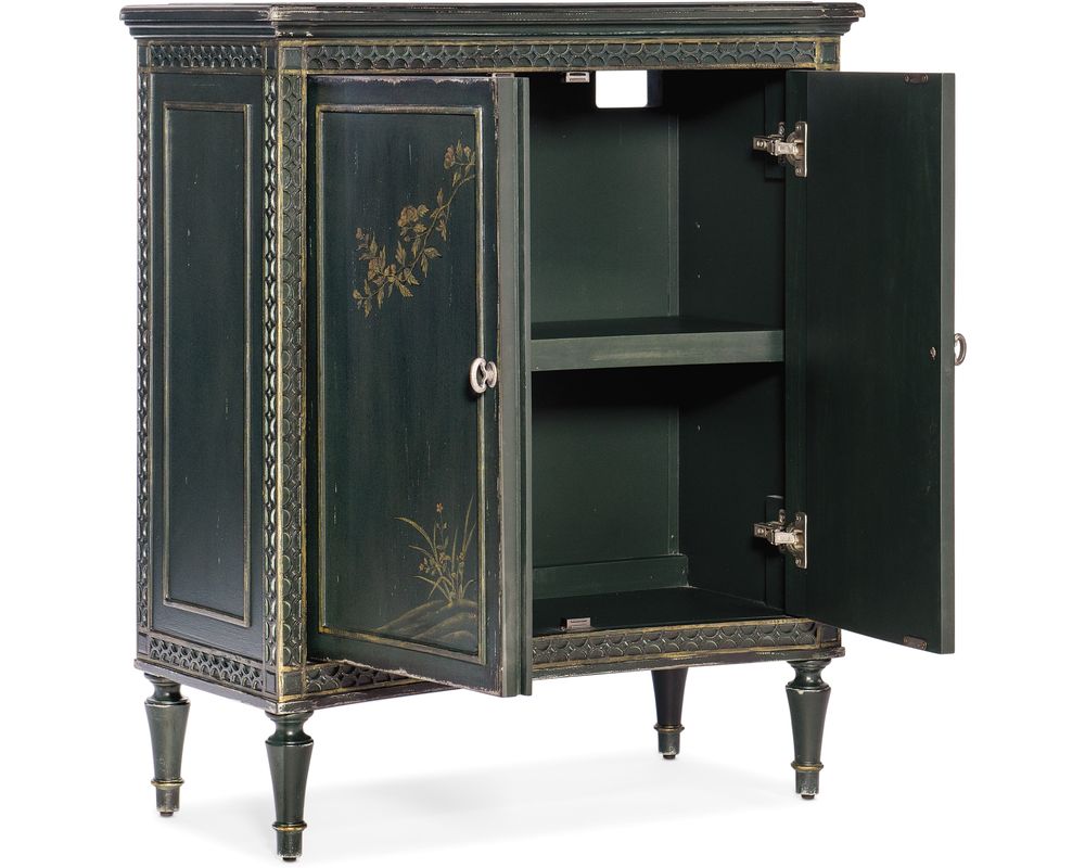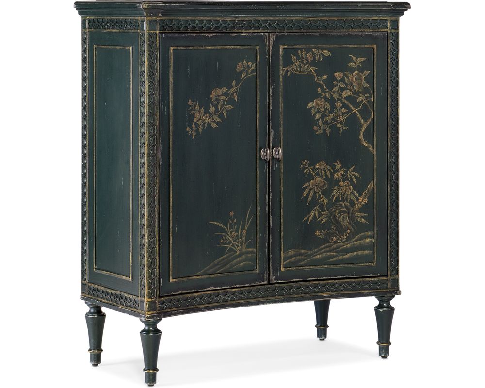 Crafted from high-quality maple veneers, resin, and hand-painting, this accent chest is not only durable but also adds a touch of sophistication to any room. The handpainted door fronts are exquisitely detailed, with decorative fretwork accents along the edges, giving it a unique and elegant look.