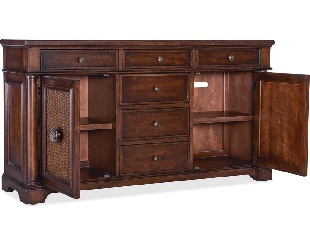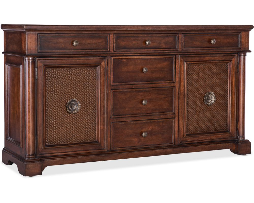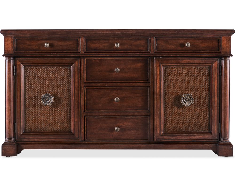 From Sofas and Sectionals.com: Introducing the elegant and functional Charleston Two Door-Six Drawer Dining Buffet, the perfect addition to any dining room. Crafted with high-quality cherry veneers and cane accents, this buffet is beautiful and durable.