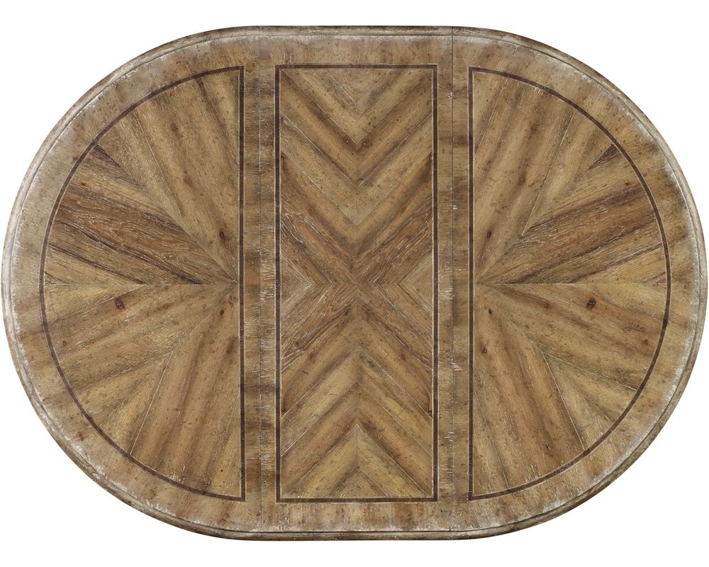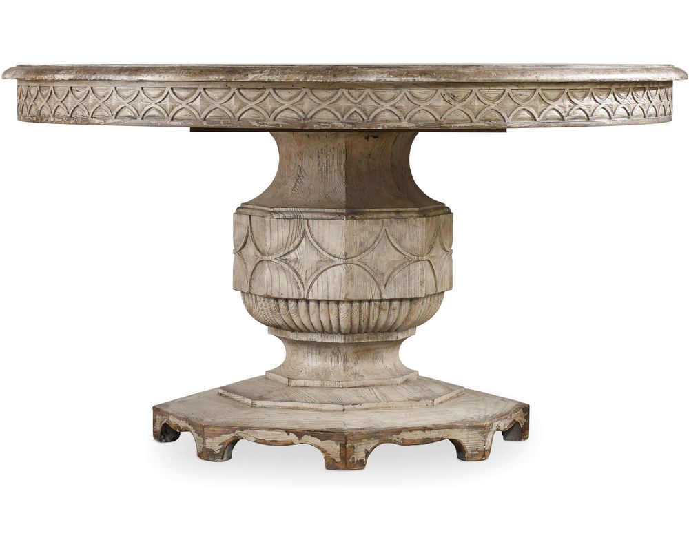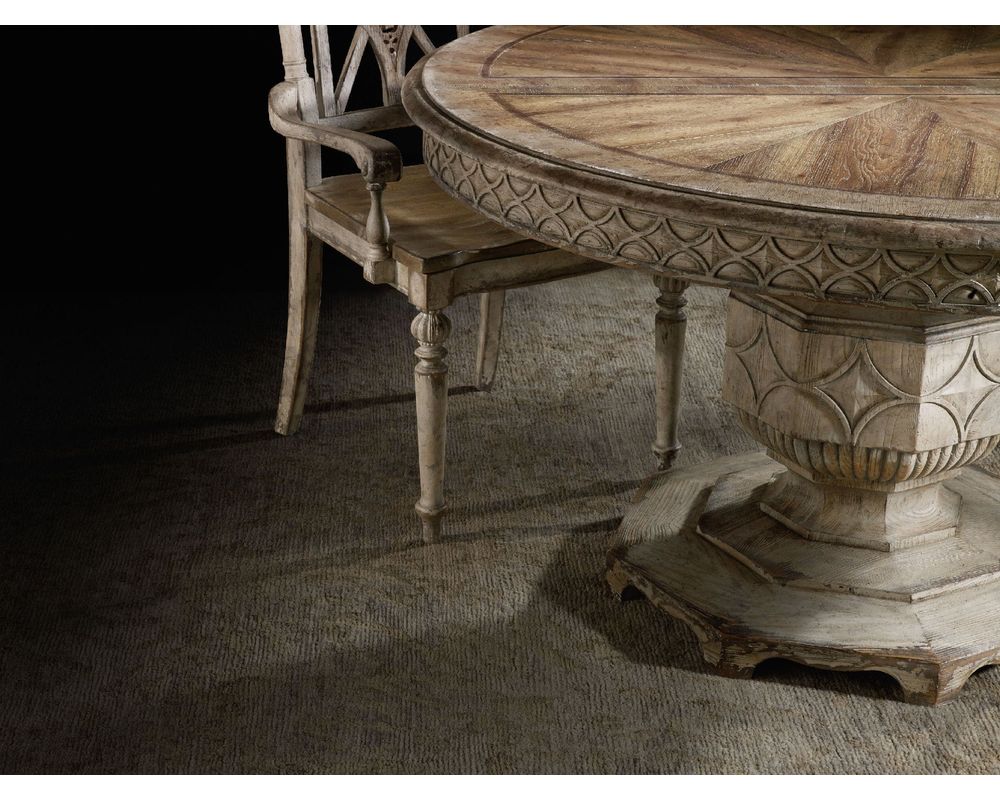 Chatelet Round Dining Table One 20" leaf extends table to 74", Will seat up to six guests with leaf. Poplar and Hardwood Solids with Pecan, Walnut and Maple Veneers with a Solid Wood Edge. The Paris Vintage finish is a distressed vintage white with fretwork overlay on select pieces.