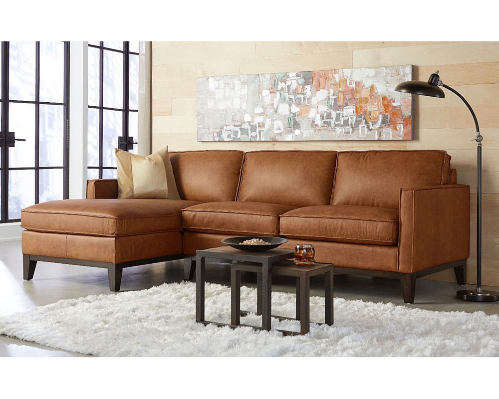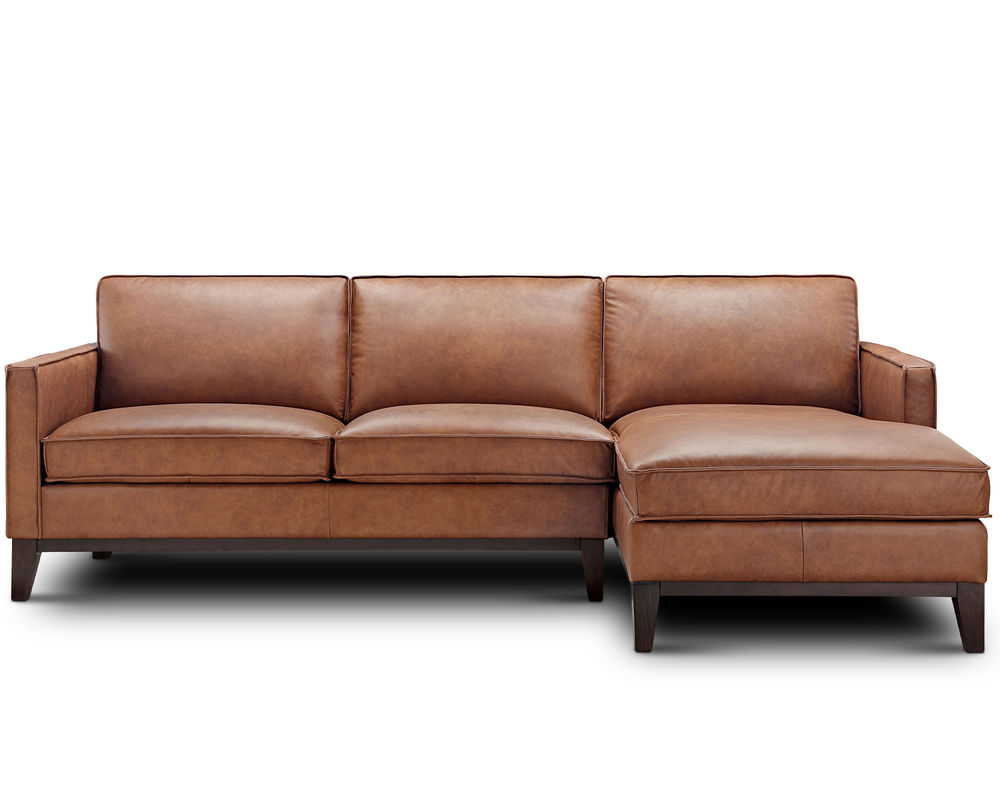 In Stock - Delivers is About 30 Days The Chelsea Leather Chaise Sectional is a luxurious and stylish piece of furniture that can add a touch of elegance to any living space. Crafted to the highest standards, the chaise sectional features top-grain cowhide leather upholstery that is sure to last. The loose inside back and seat cushions can be rotated to ensure the longevity of the 2.1 high-resilience foam and the leather. The box border seat and back cushions also feature a flanged welt for added style and sophistication. The sinuous springs beneath the cushion provide extra support while the seat core contains individually pocketed coil springs encased in a high-resiliency foam. The backs and sides are fully padded all the way around for a premium look and feel. The wood platform rail that runs along the bottom of all four sides with the flared wood legs gives this piece of furniture an extra level of sophistication. The Chelsea Leather Chaise Sectional is sure to be a timeless piece of furniture for any living space.
