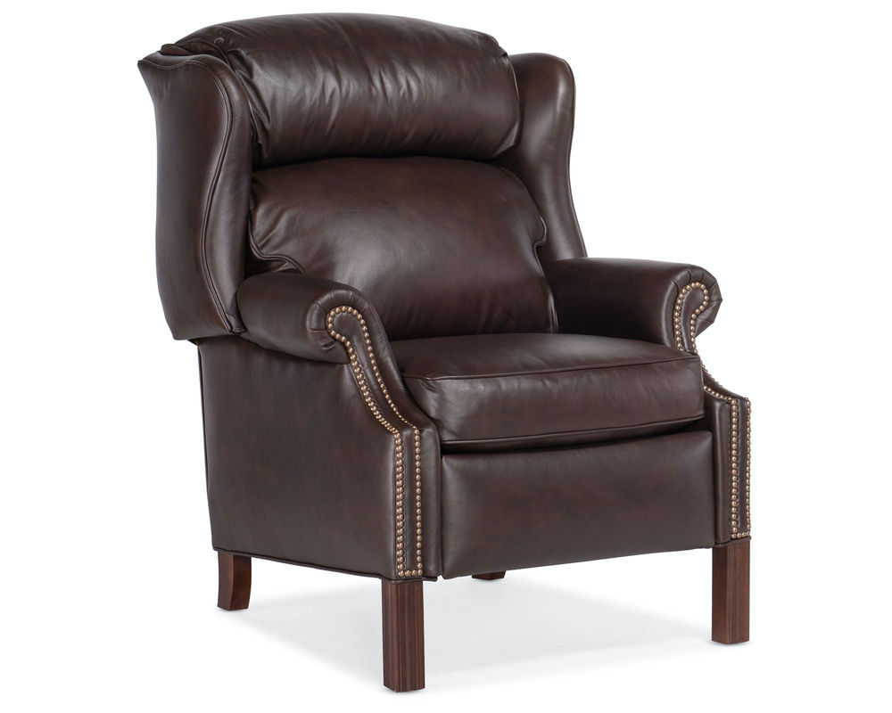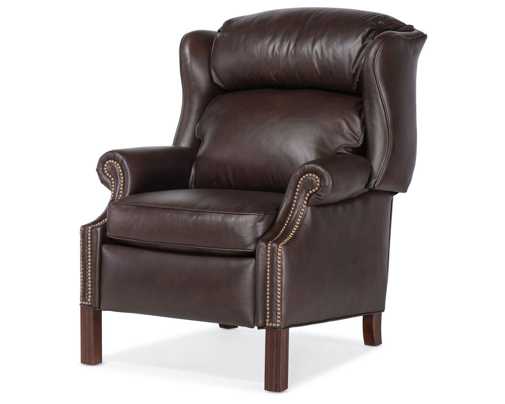 The Chippendale Reclining Wing Chair includes a standard #9 nailhead trim in French natural finish and Mahogany wood finish. It features a semi-attached seat back and a high resilient foam seat. There is something irresistible about a plush recliner that often makes it the most desired seat in the house. After all, who doesn’t enjoy the indulgence of lounging like a king or queen at the end of a long day? Emanating in luxury – and proving that comfort and sophisticated design can co-exist – our recliners guarantee long hours of relaxation without having to forgo style. With a wide variety of recliners available, it’s easy to express your personal style while achieving your “royal-status.” Hand-crafted with the highest quality reclining mechanisms available today for a deeply luxurious ride, all you’ll have to worry about is who gets control of the remote. Shown in Top Grain Leather Navy.