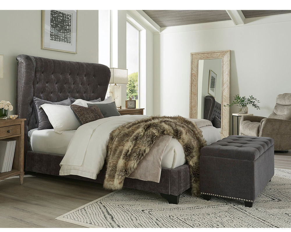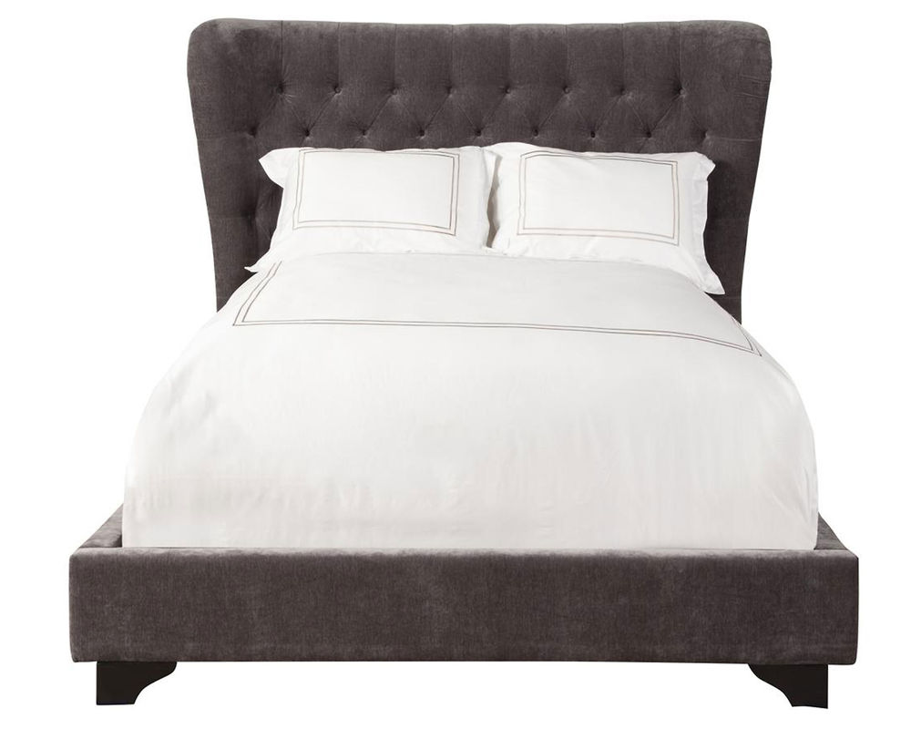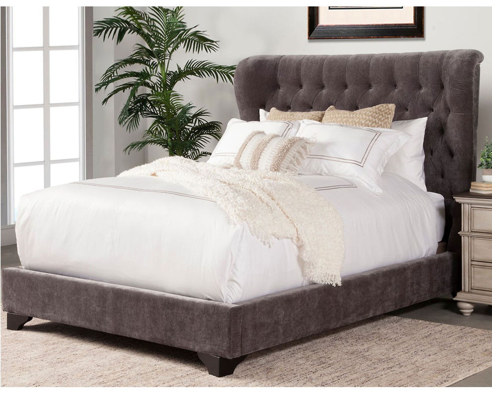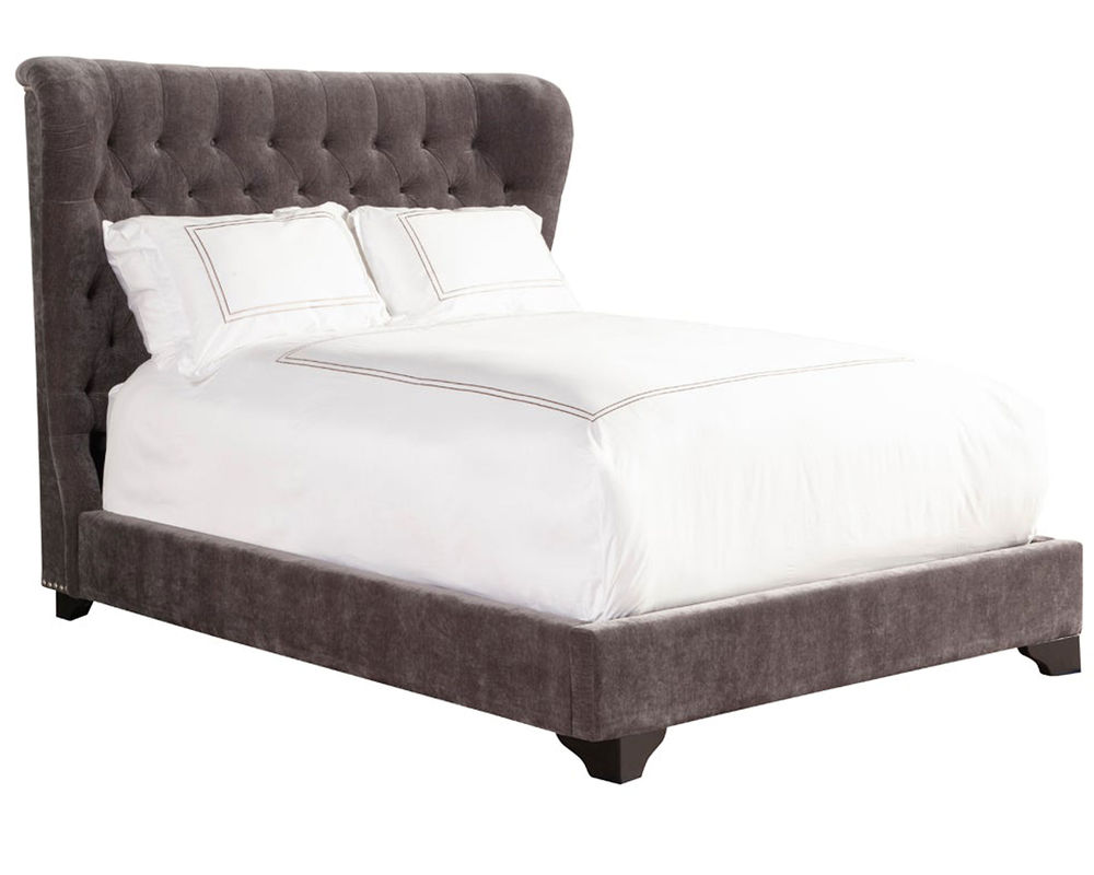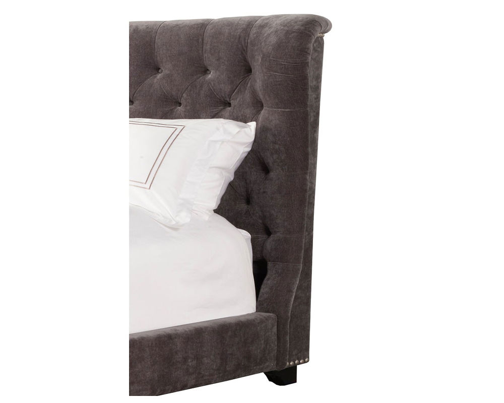 Impressive from every angle, the Chloe upholstered bed will be the focal point of any bedroom. Its gently curved silhouette ensconces you in style while elegant button tufting adds rich character. Upholstered in a decadent velvety fabric, this bed’s upholstered siderails and footboard are complemented by scalloped wood feet.