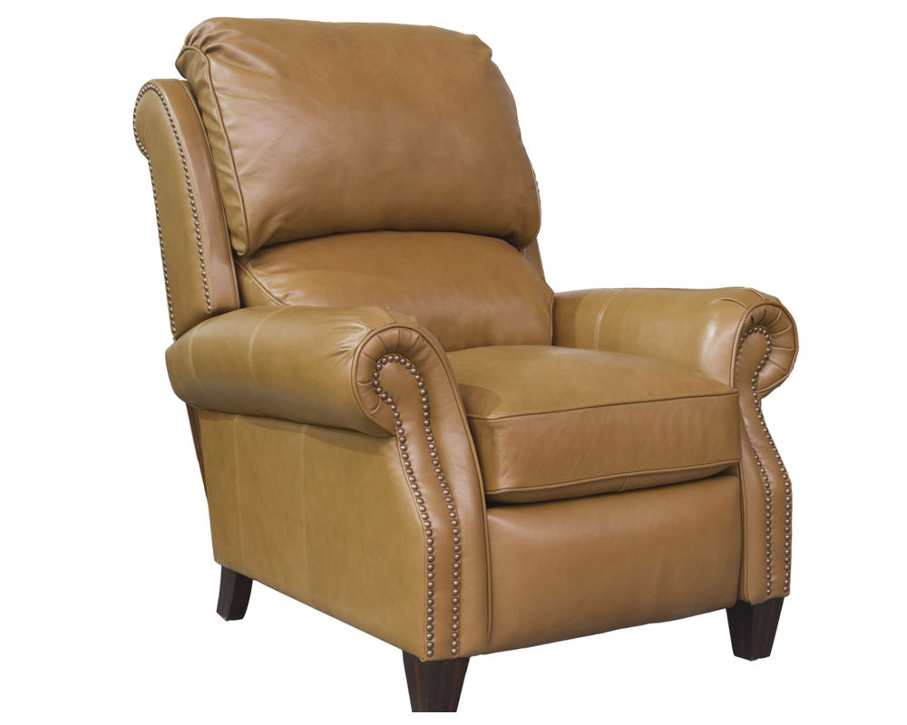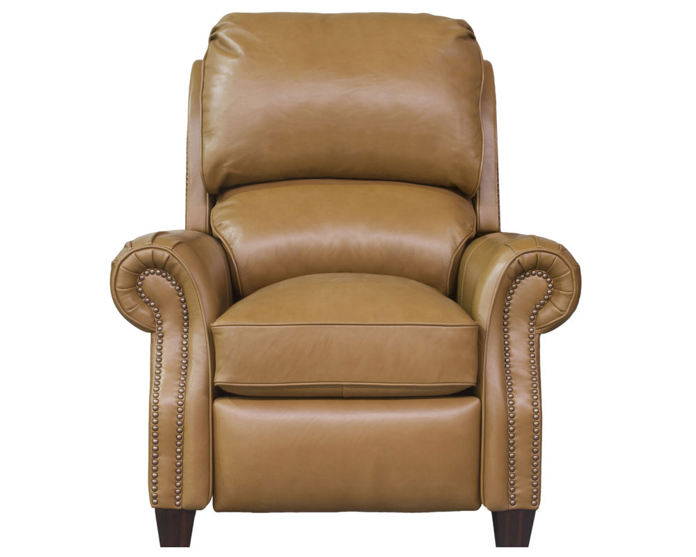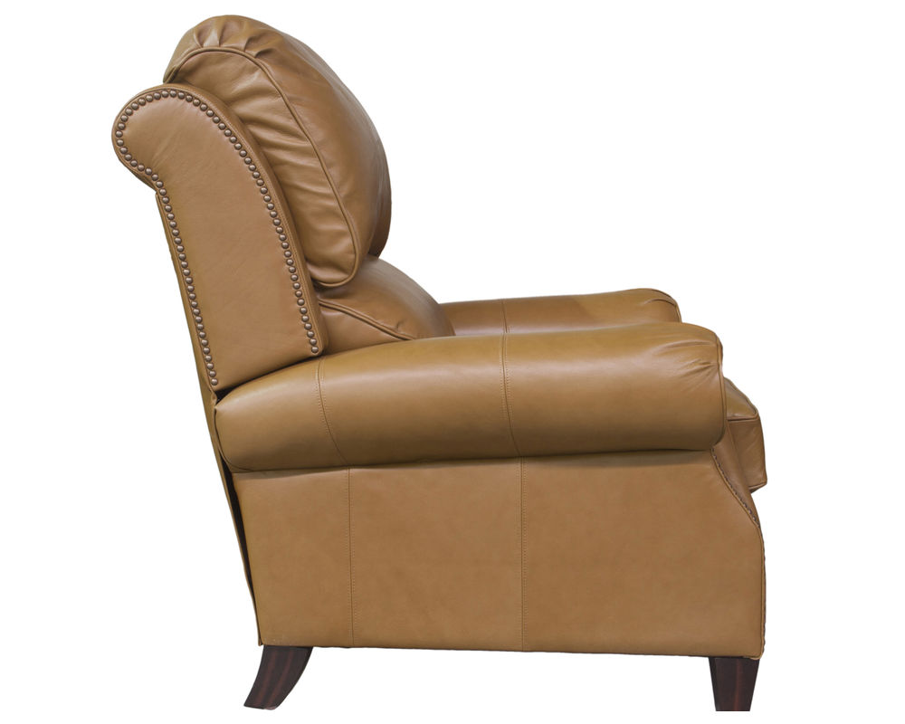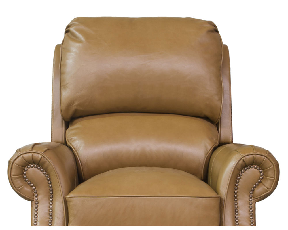 Introducing the Churchill Leather Recliner, a unique blend of classic elegance and luxurious comfort. This 3-way low-leg recliner stands out with its classic pub-back design, knee-back rolled arms accented with nail-head trim, and hand-carved wood legs finished in an Espresso color. The adjustable zippered upper and lower back pillows add a touch of personalization to your comfort.