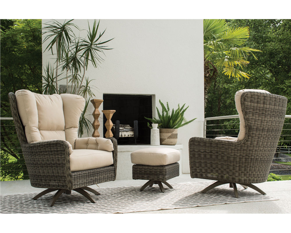 Our Cocoon lounge chair is a modern interpretation of popular organic mid-century shapes. Featuring weathered hues of gray synthetic woven material, this chair features a fixed swivel base that is powder-coated aluminum for durability against the weather.